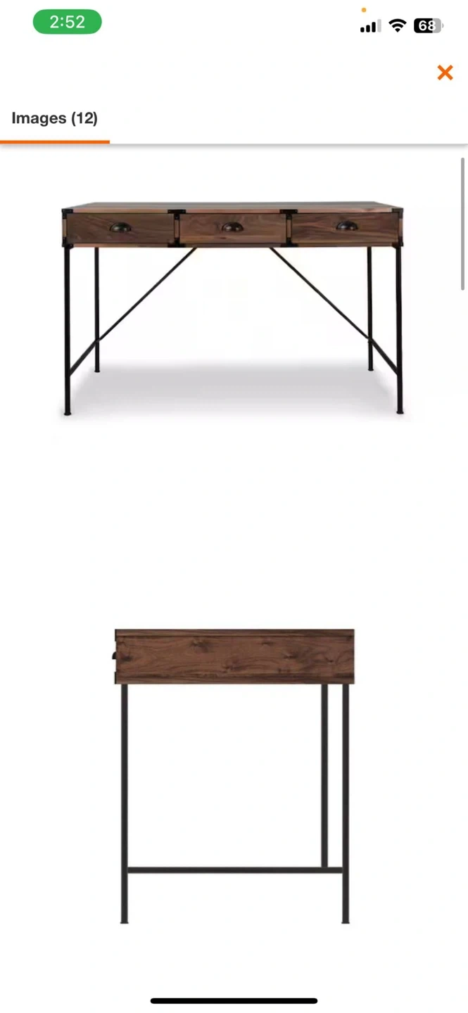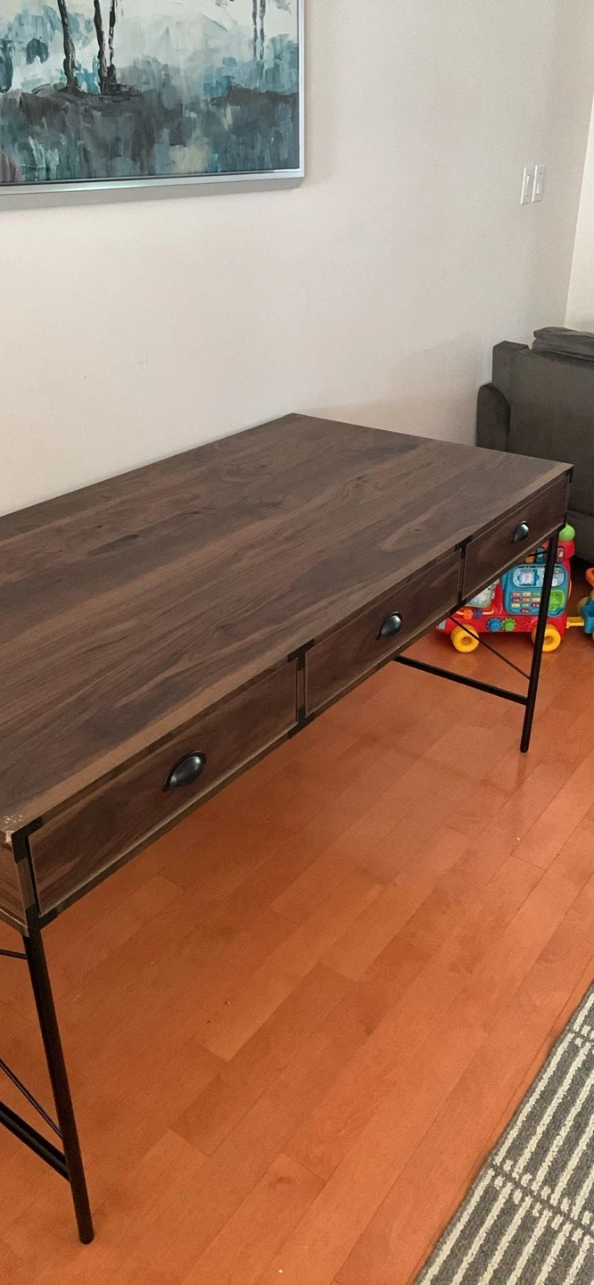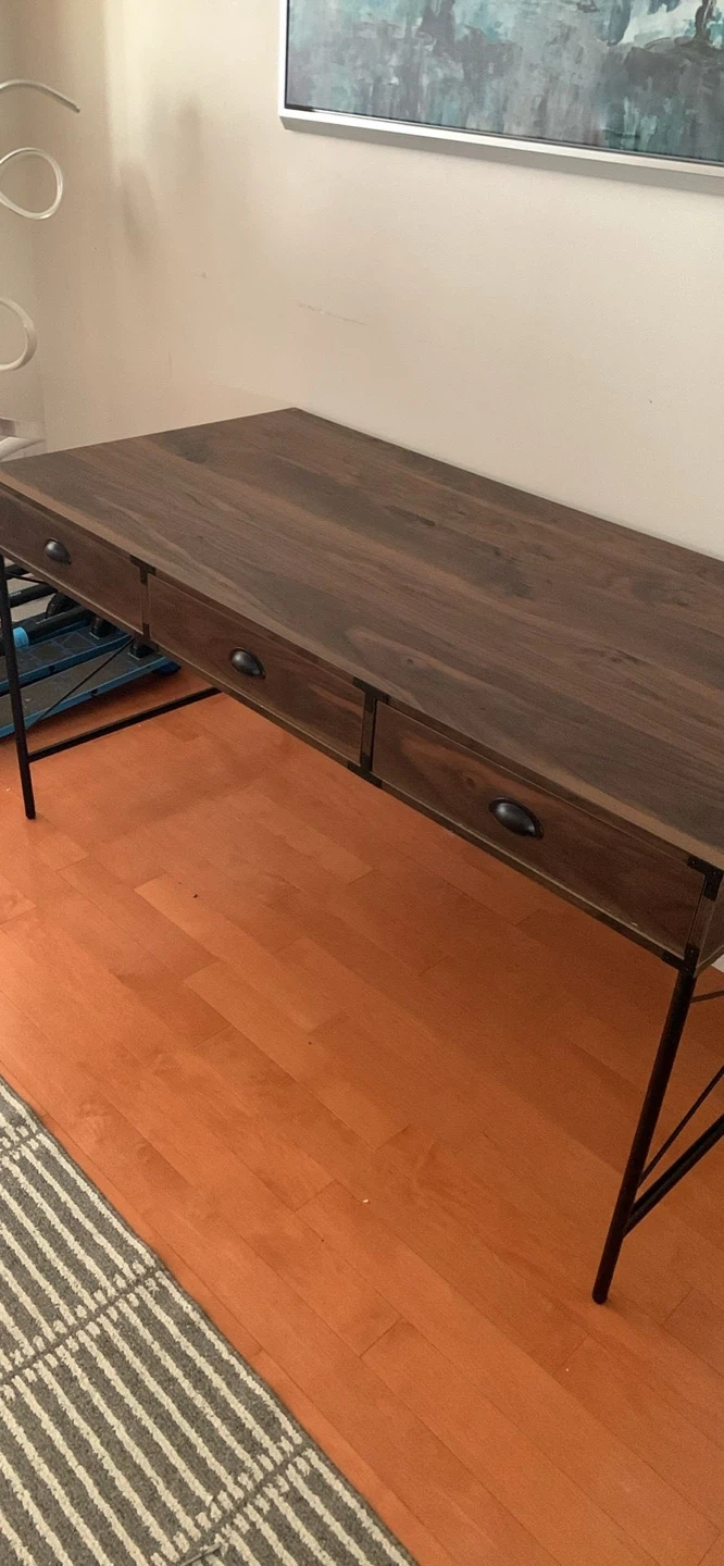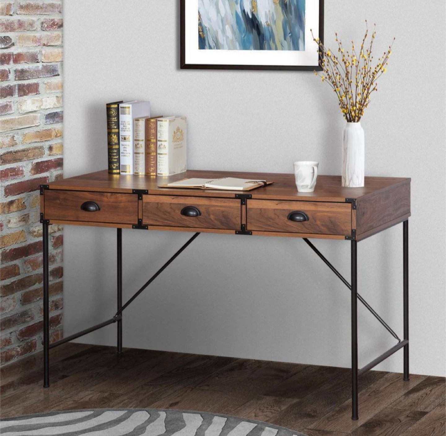 Selling a Laurel Foundry Modern Farmhouse desk! It features a rustic design with a wooden top and black metal legs. The desk has three drawers for storage. Dimensions are 30" H x 47" W x 23" D