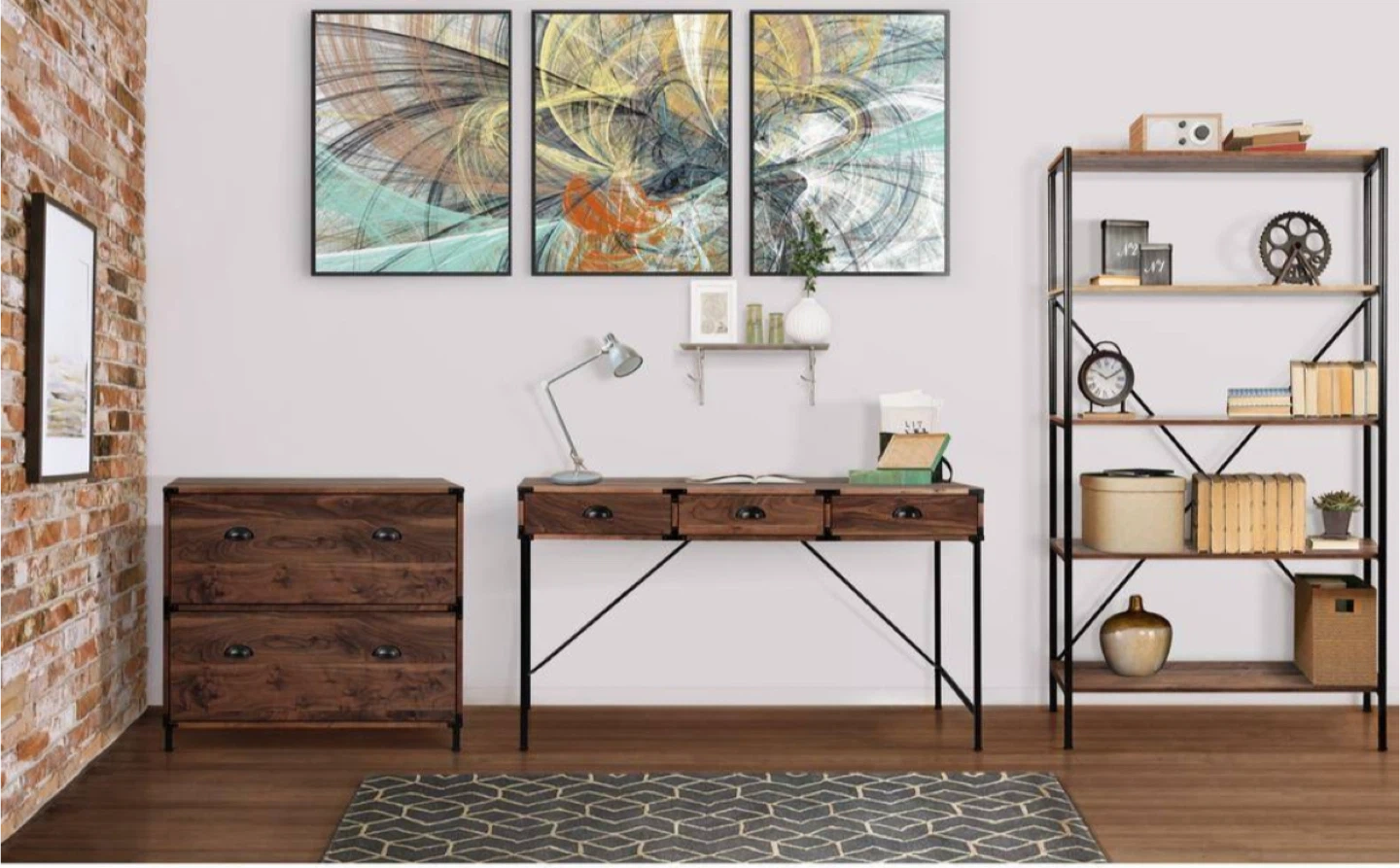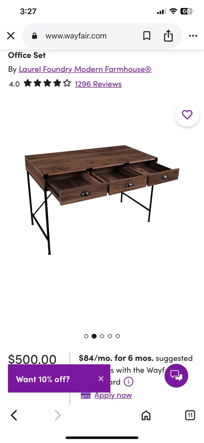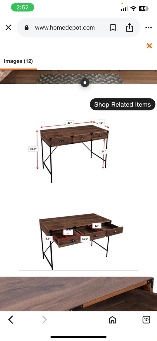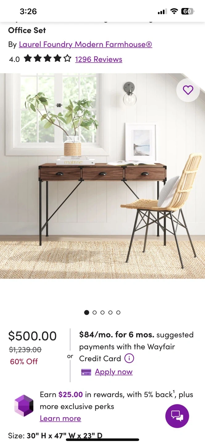 Selling a Laurel Foundry Modern Farmhouse desk! It features a rustic design with a wooden top and black metal legs. The desk has three drawers for storage. Dimensions are 30" H x 47" W x 23" D