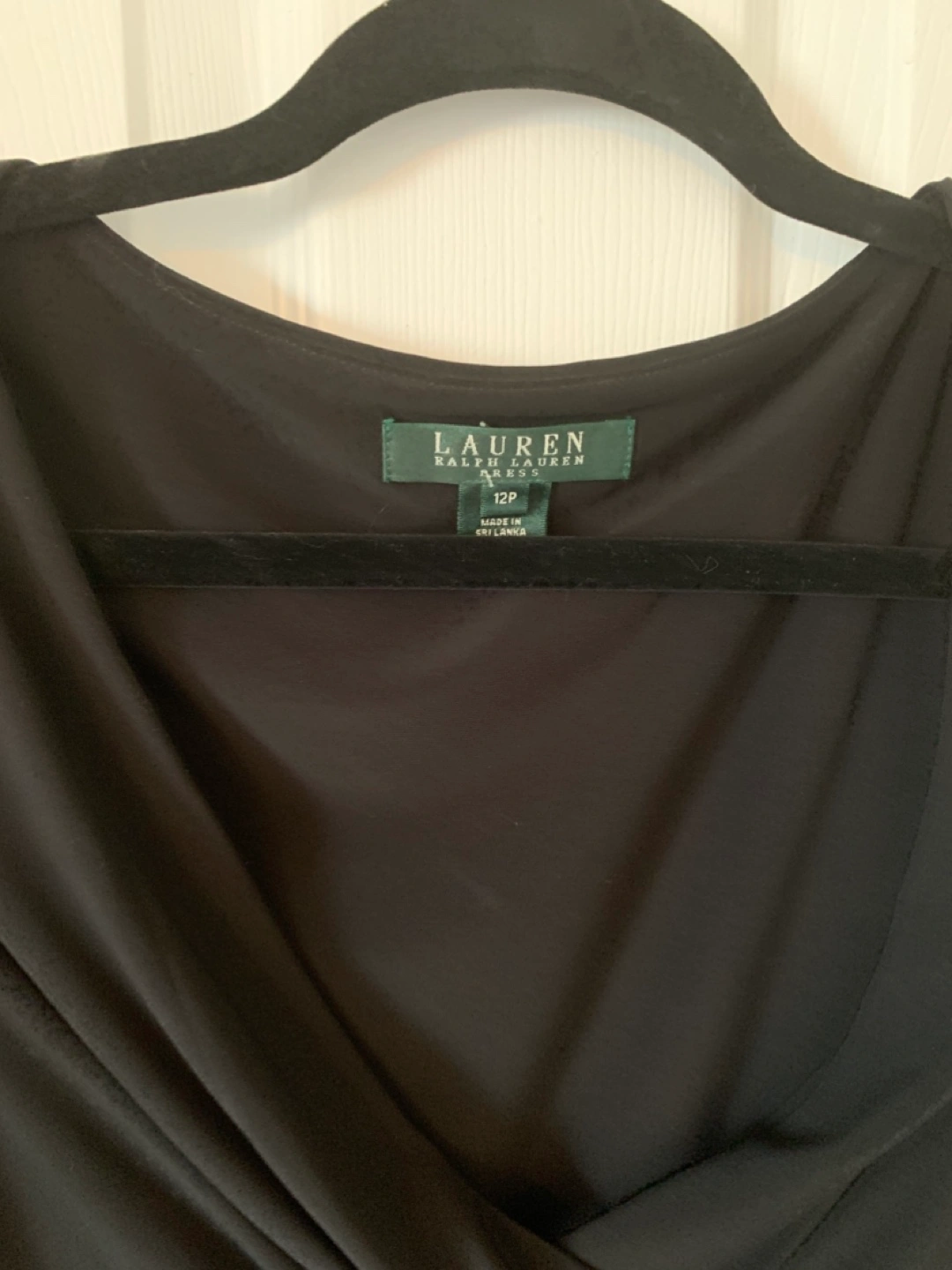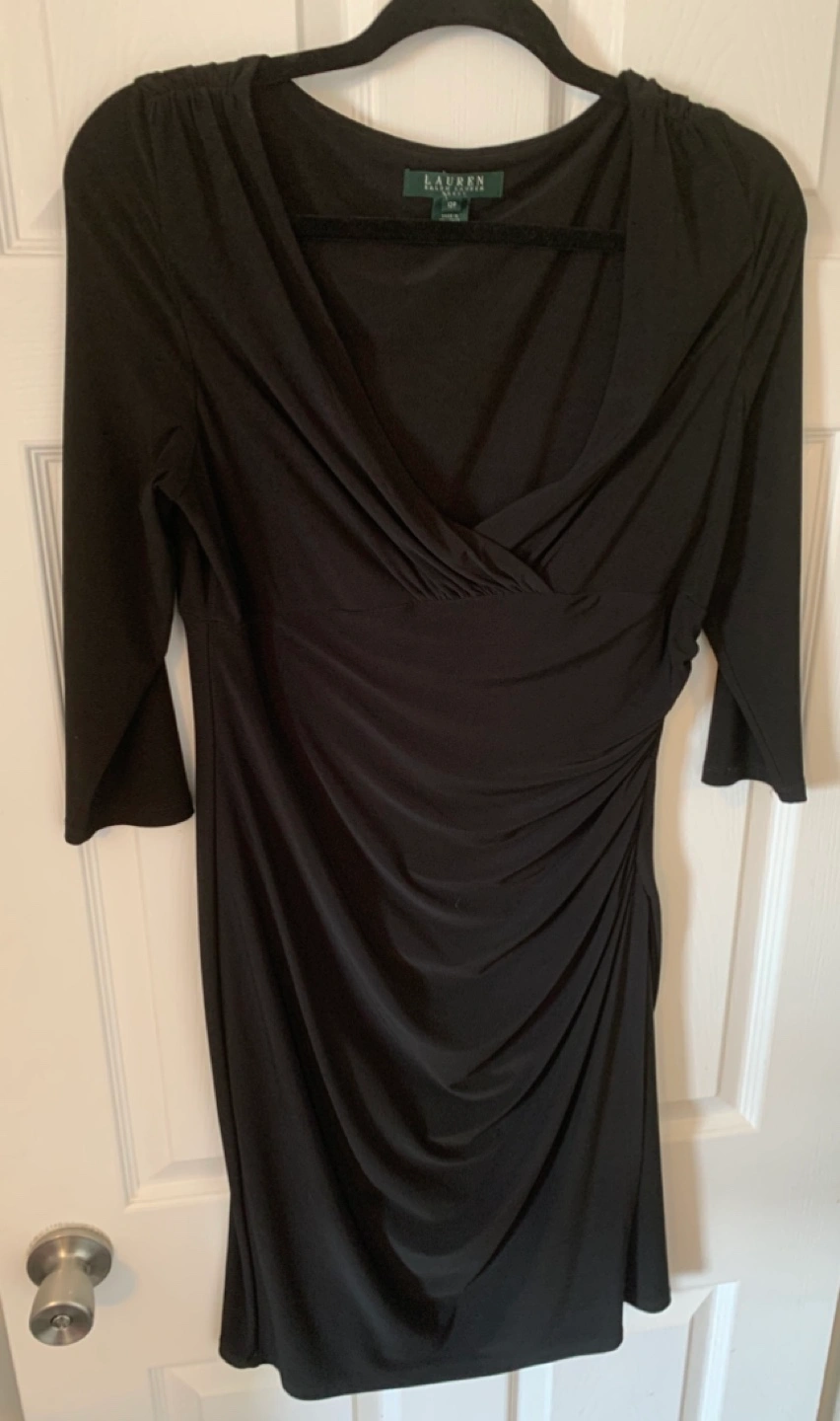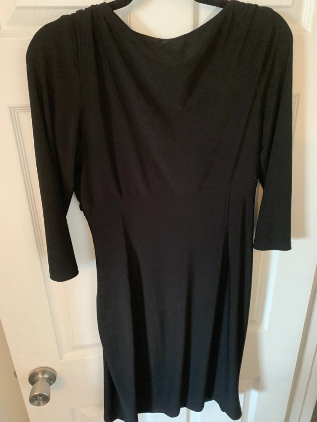 Elegant black dress. Three-quarter sleeves. V-neckline. Draped design. Size 12. Recently Dry cleaned for sale Smoke free, cat friendly home Pick up at home or at super center