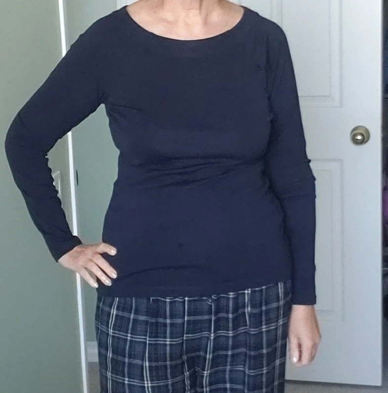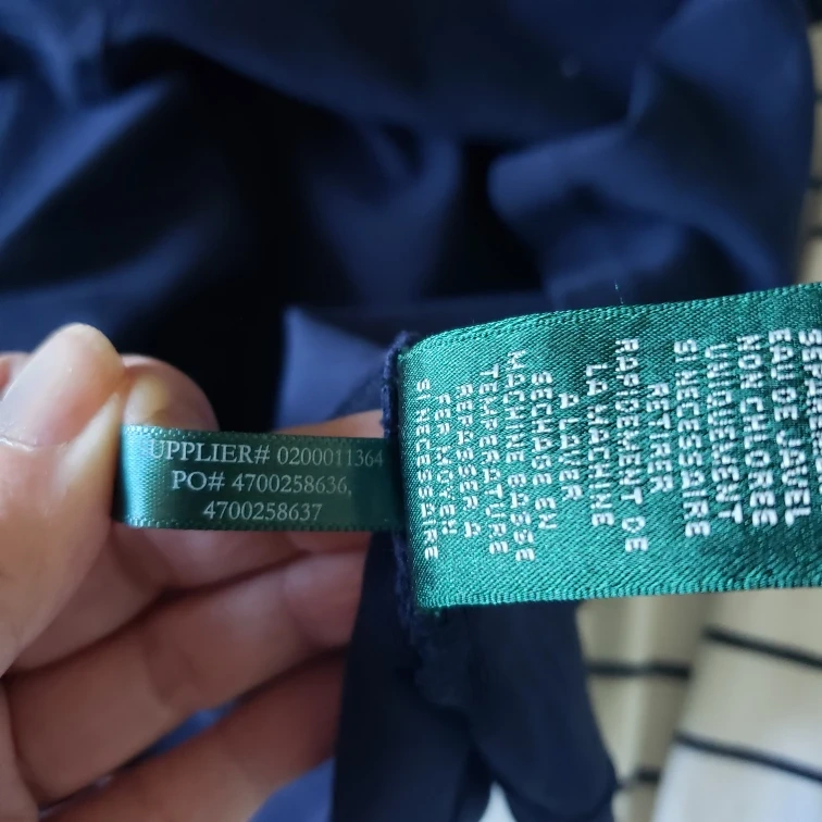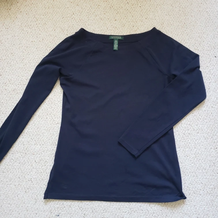 Navy blue long-sleeved shirt. Boat neck. Size large. 95% cotton, 5% elastane. Machine wash cold. From no smoke/pets home