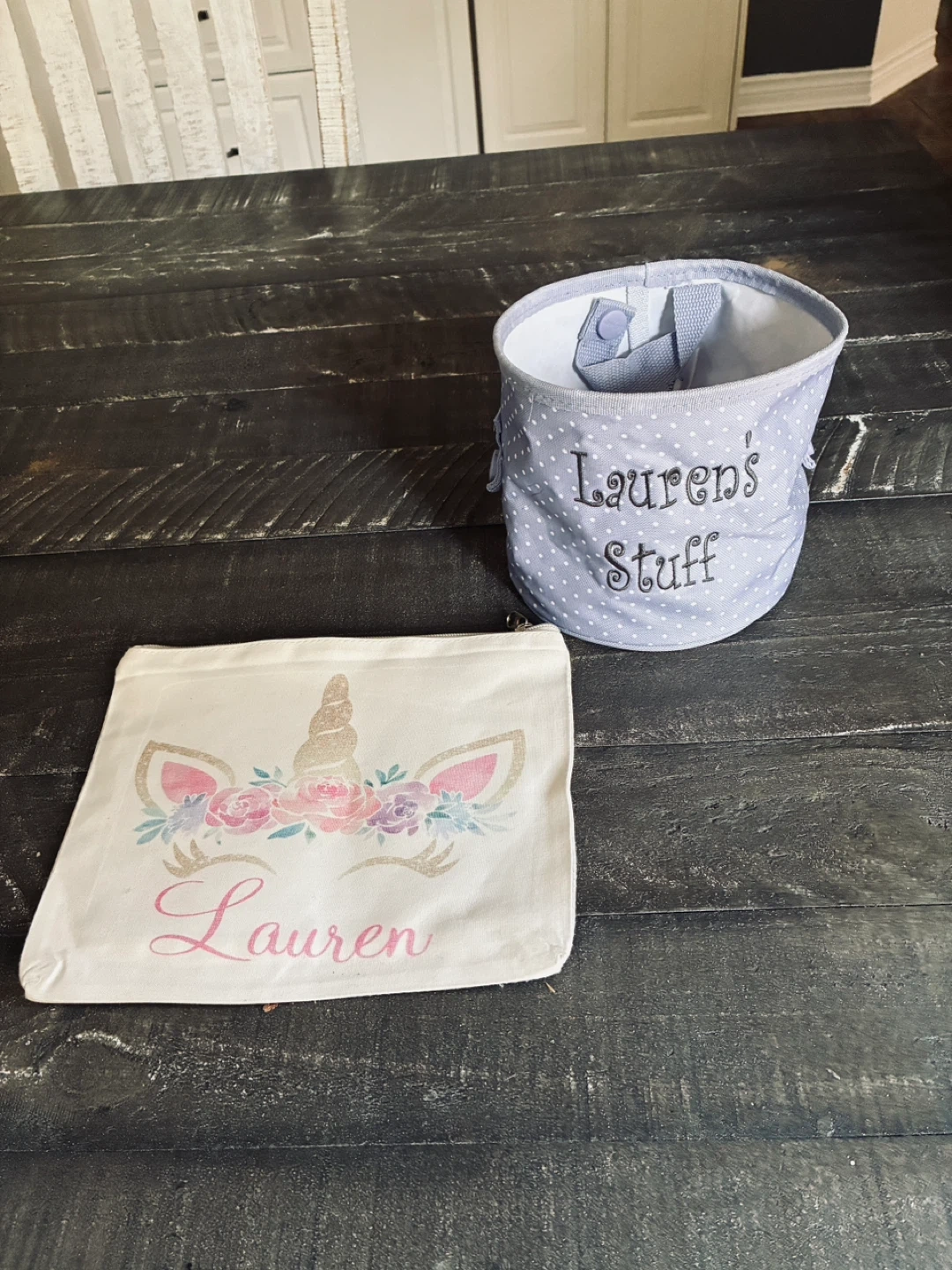 I'm selling a cute storage bin labelled 'Lauren's Stuff' and a matching unicorn bag. Both are in great condition and perfect for organizing a kid's room or carrying small items. The bin is a light blue with white polka dots, and the bag features a colourful unicorn design with the name 'Lauren'. Take both for $5
