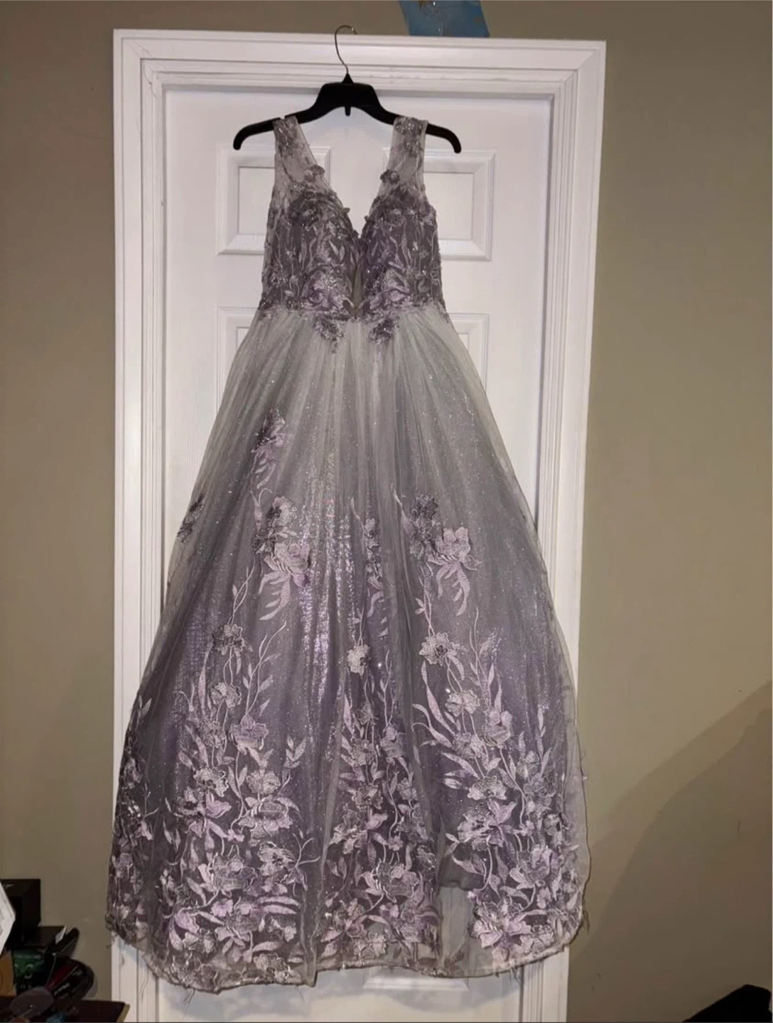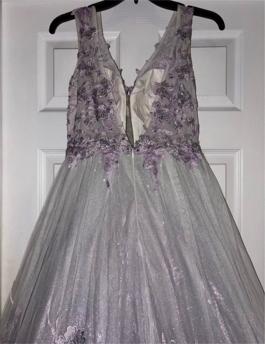 Beautiful formal dress with intricate lavender floral embellishments. Perfect for prom or any special occasion. The dress features a flattering silhouette and delicate detailing, making it a standout piece. It's in great condition and ready to make someone's evening unforgettable!