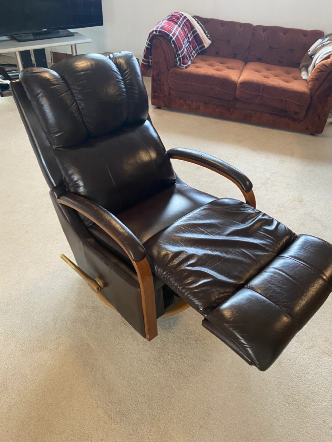 Selling a comfy brown leather rocker recliner. It's in good condition and would be perfect for a living room or den. The leather is soft and the chair rocks and reclines smoothly. It's a great spot to relax after a long day!