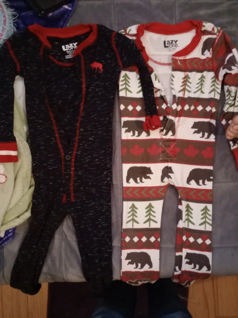 Two cute Lazy One pajama onesies in size 2T. One has a bear and maple leaf pattern, and the other has a moose logo. Perfect for keeping your little one cozy!
