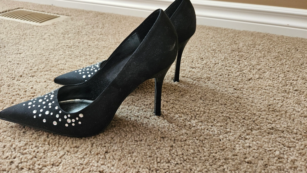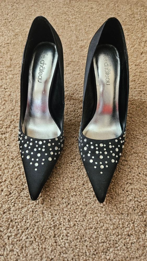 These stylish black heels from Le Chateau feature a pointed toe and are adorned with rhinestones. Perfect for a night out!