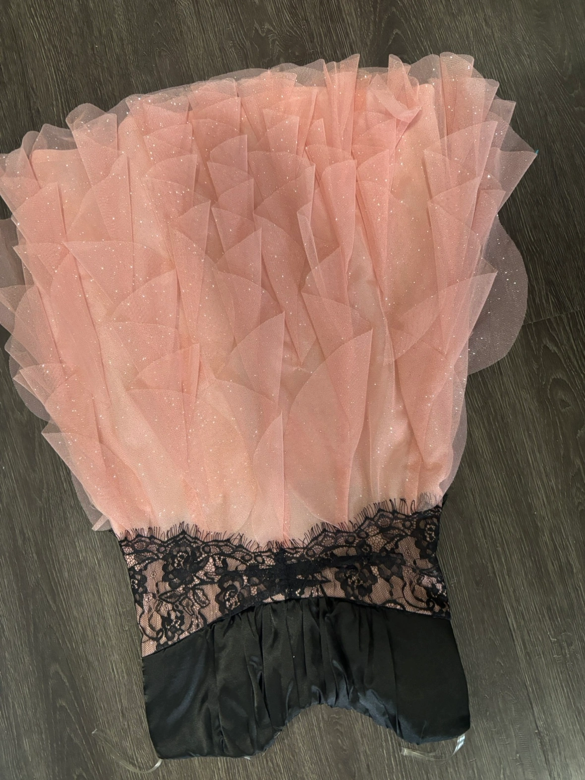 A beautiful mini dress featuring a black bodice, black and pink lace detail, and a layered pink skirt with glitter. Perfect for a special occasion.