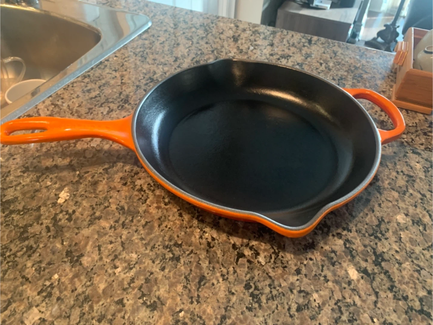 Selling a Le Creuset skillet in orange. It's 10 1/4 inches (26 cm) in diameter. It's in good condition and ready for a new home