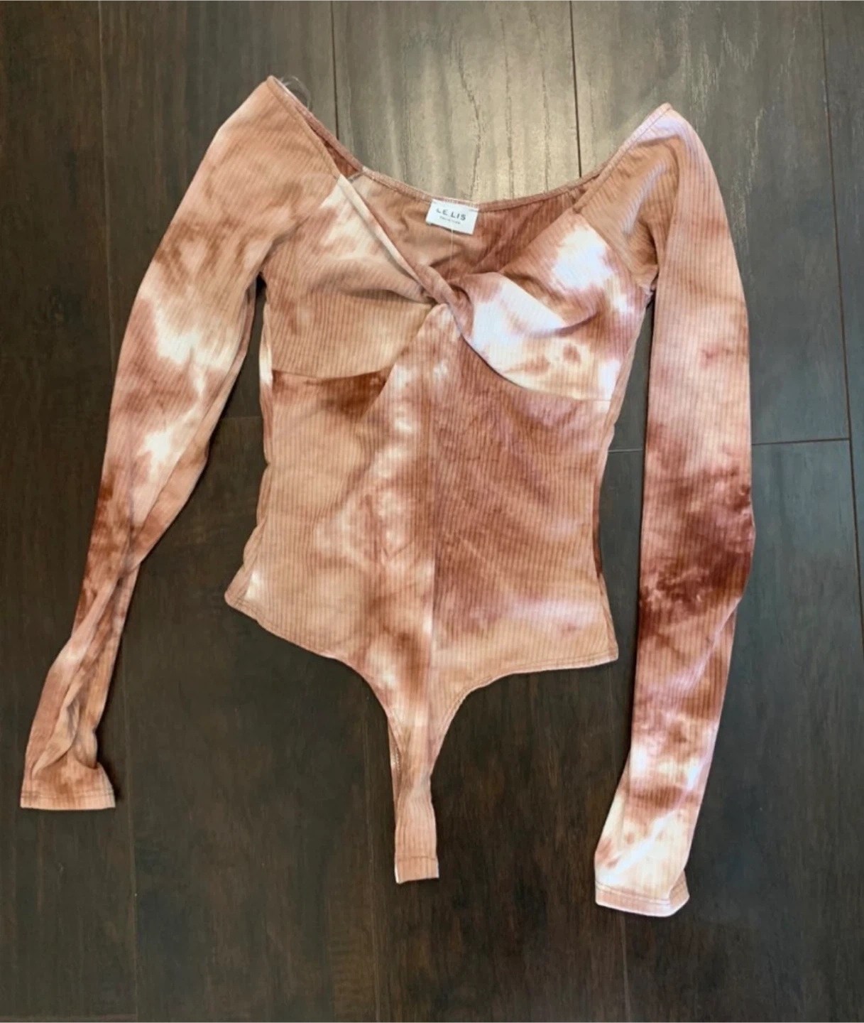 Cute Le Lis bodysuit with a tie-dye pattern in shades of brown and white. It has long sleeves and a flattering neckline. Perfect for layering or wearing on its own!