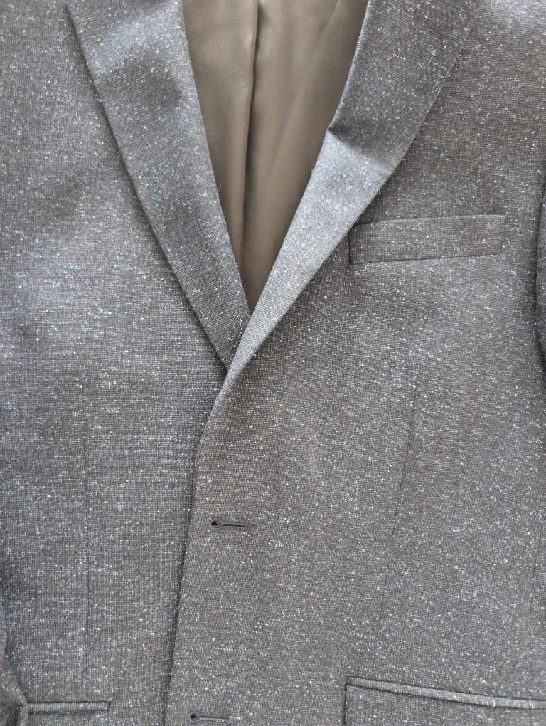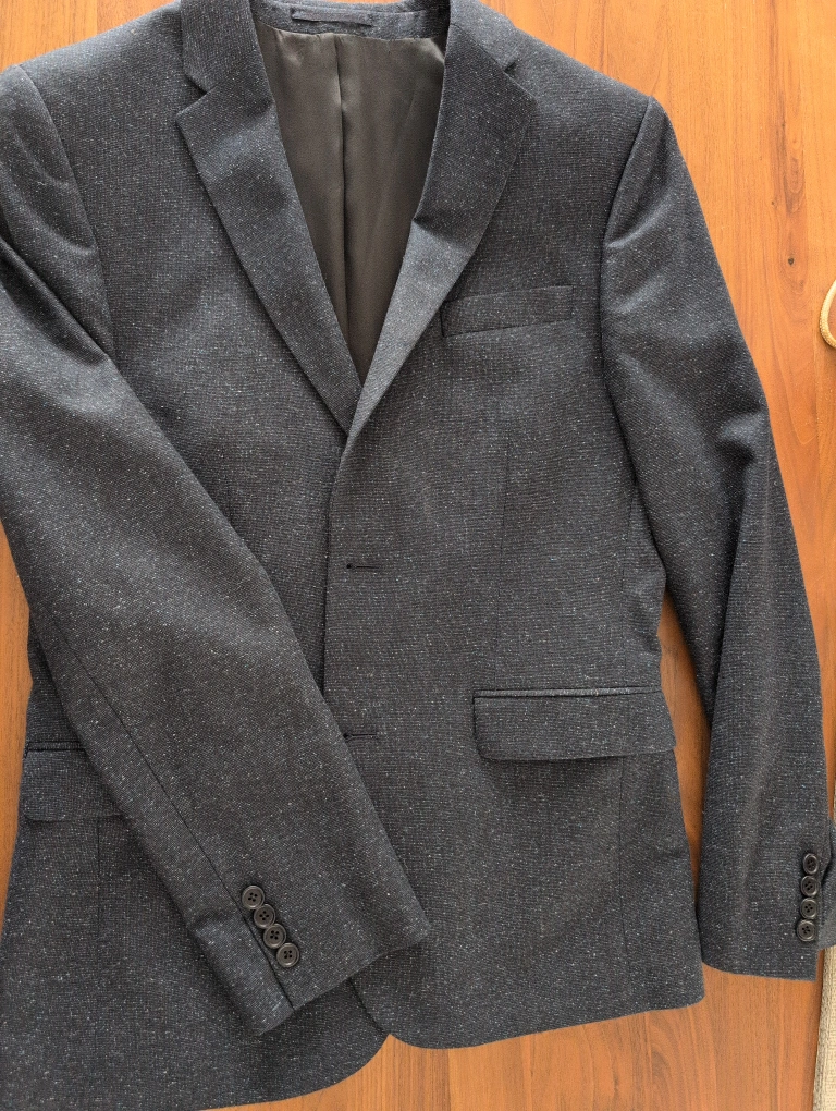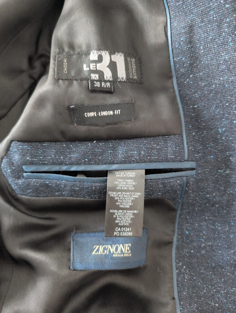 38R/R with a Coupe London Fit. The fabric composition includes virgin wool and silk. The lining is made of polyester and viscose. It's in great condition and ready for a new home
