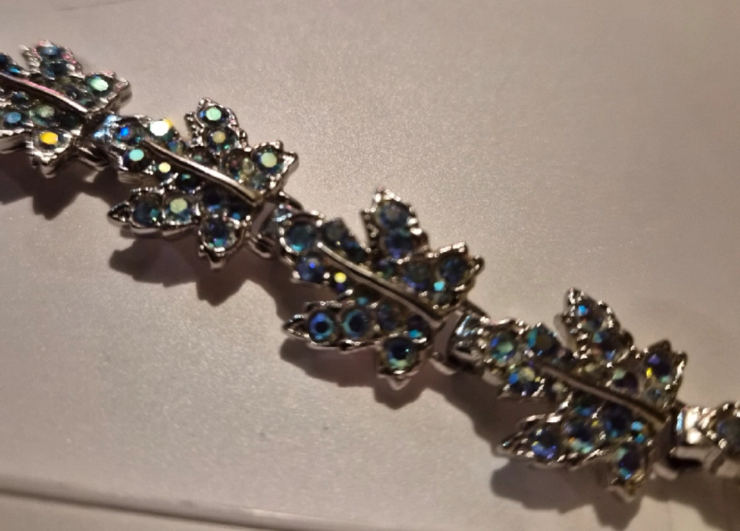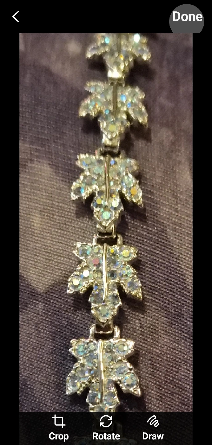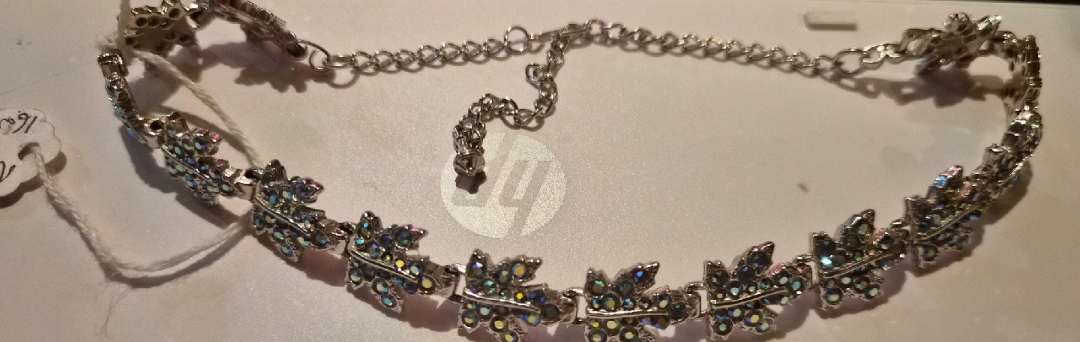 This is a lovely silver-tone necklace featuring a leaf design with sparkling rhinestones. It's in great condition and would add a touch of sparkle to any outfit. I bought this beautiful vintage piece last year but just never got the chance to wear it. selling for a really great price I bought it at the vintage marketplace for $116.00 im letting go for a low price firm on $40