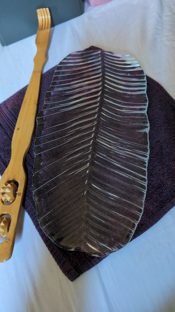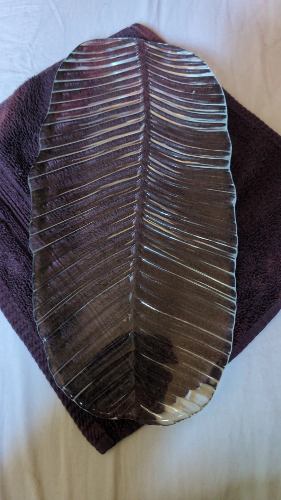 Selling a unique leaf-shaped decorative glass tray. It's in great condition and would make a lovely addition to any home