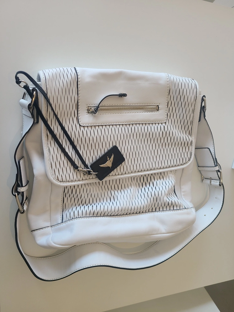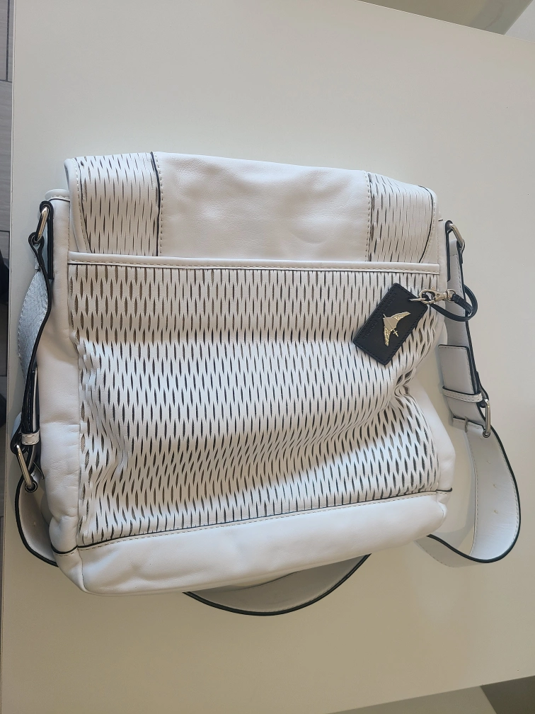 Selling a stylish white leather messenger bag from Leandro Borghi. It's in great condition and perfect for everyday use. The bag features a unique perforated design and a comfortable shoulder strap. Inside, there are multiple compartments to keep your belongings organized. It's a beautiful and functional piece!