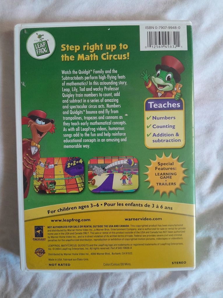 Leap Frog Math Circus Video DVD, with learning games, for kids 3-6