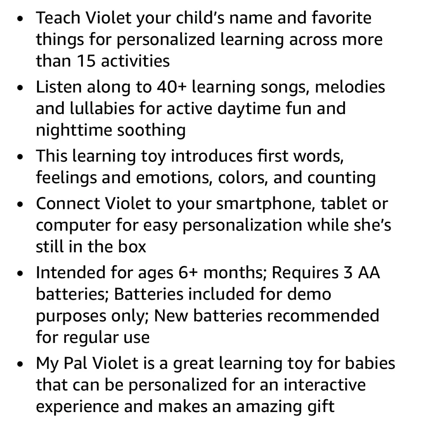 📦 Brand New & Sealed – Never Used 🎁 Perfect, giftable item for babies and toddlers! Teach Violet your child’s name and favorite things for personalized learning. This adorable plush puppy plays 40+ learning songs, melodies, and lullabies for daytime fun and bedtime soothing. ✨ Features: • Personalized songs and fun learning games • Teaches first words, emotions, colors, and counting • Connects to smartphone or tablet for easy setup • Includes demo batteries (3 AA required for regular use) • Suitable for ages 6+ months 🏡 From a smoke-free, pet-free home 💰 Retail: $70 | Asking: $40 📍 Pickup near Islington & Finch or Jane & Eglinton 🚗 Delivery available within a reasonable distance
