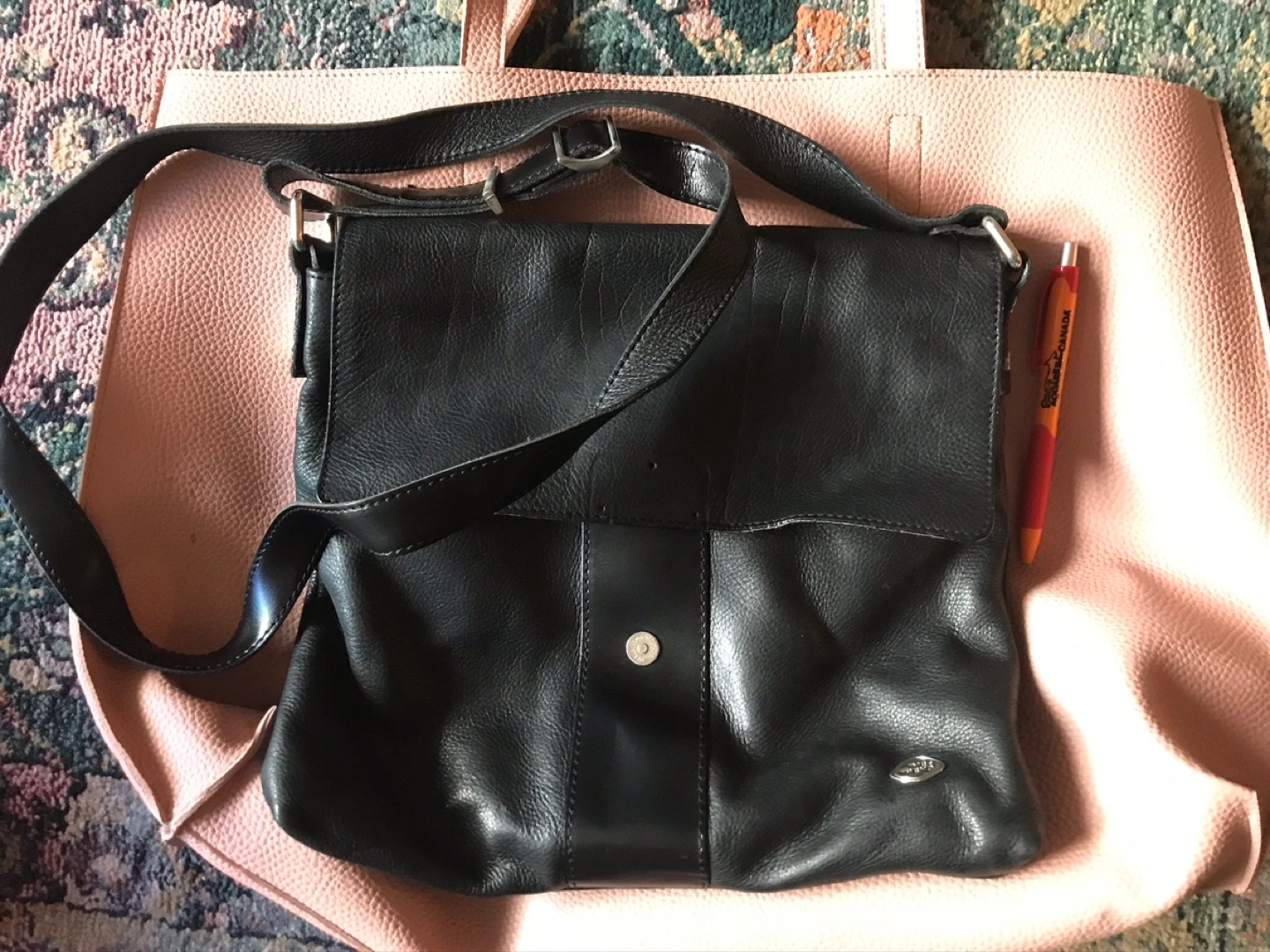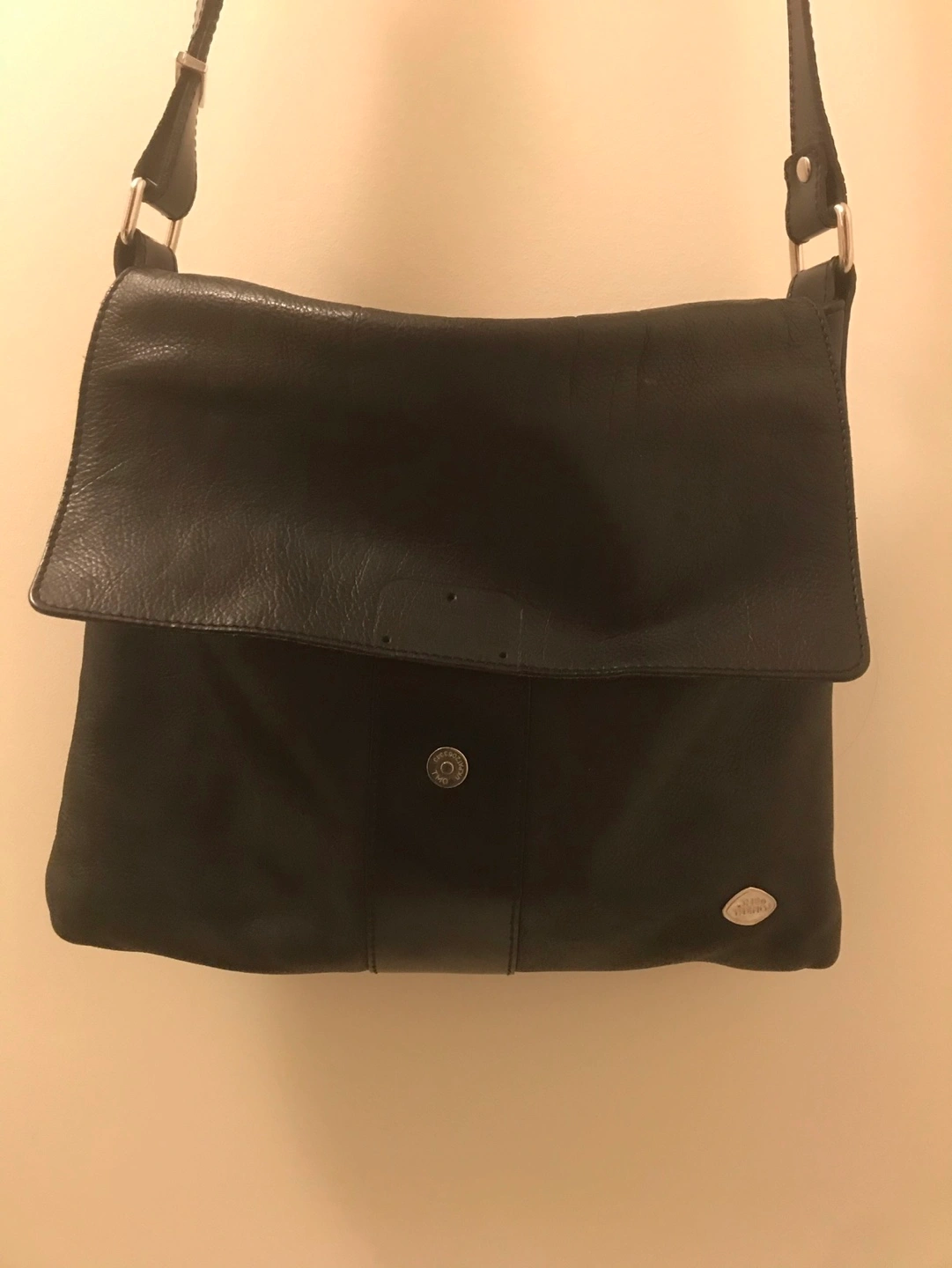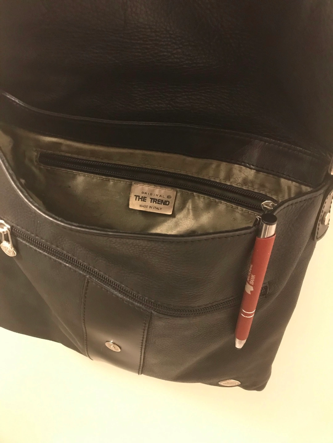 3 Zippered compartments: under front flap, inner compartment and back. Soft black leather. Holds a good amount of stuff. I’ve been able to fit a small S’well bottle and paperback along with a few essentials! A piece of the front hardware has broken off (see pic). You may have the skills and materials to fix it but the bag serves its function just fine without doing so. Smoke-free, pet-free home. Cash only please