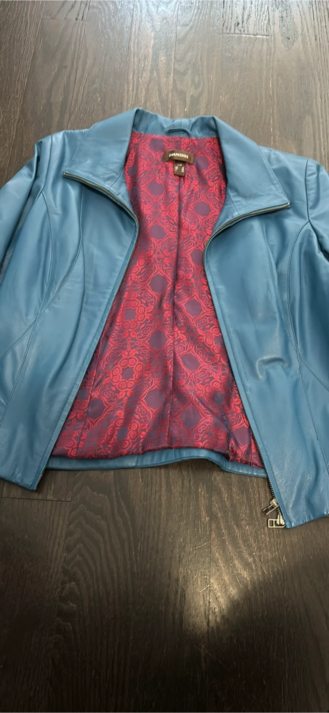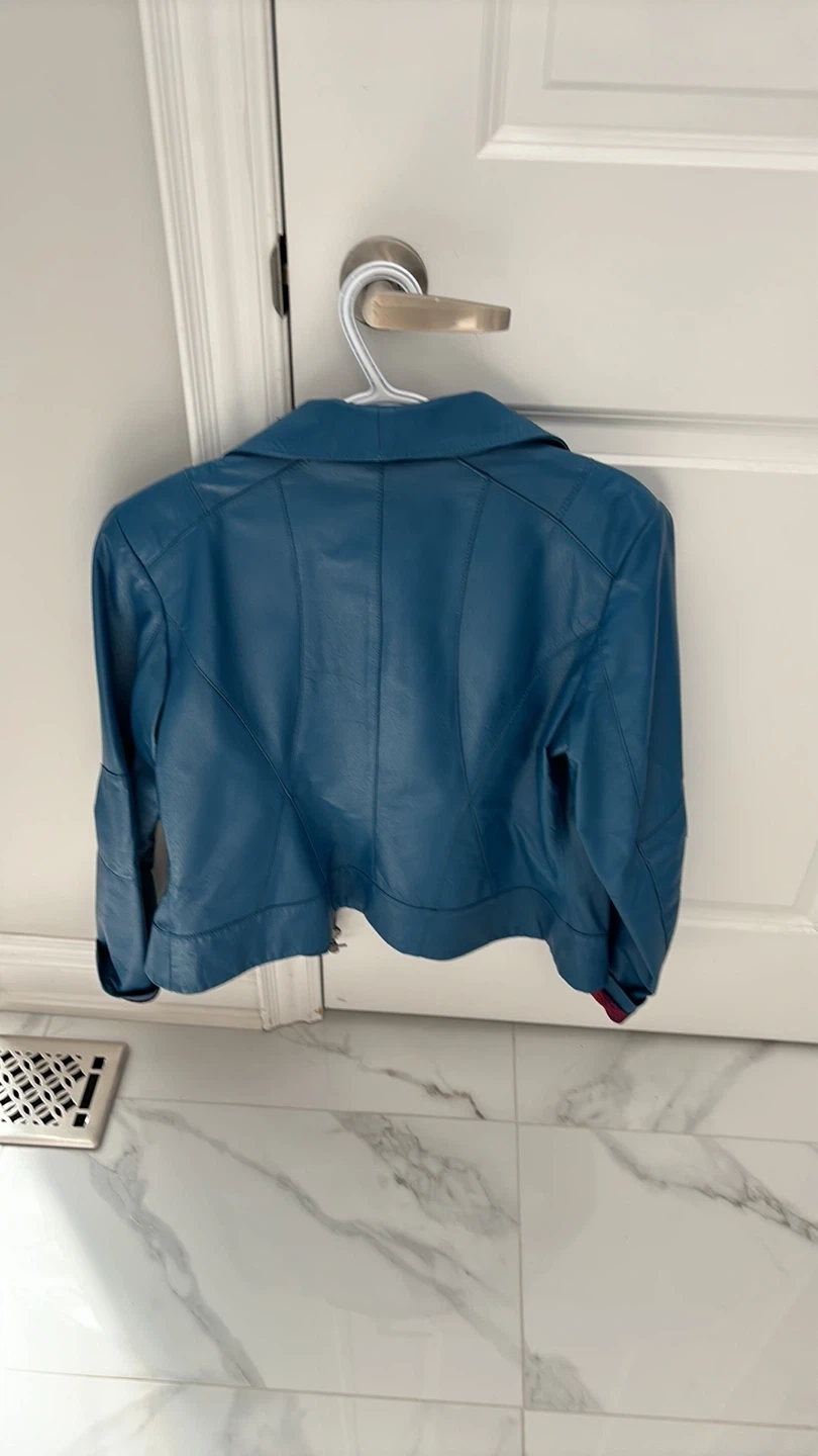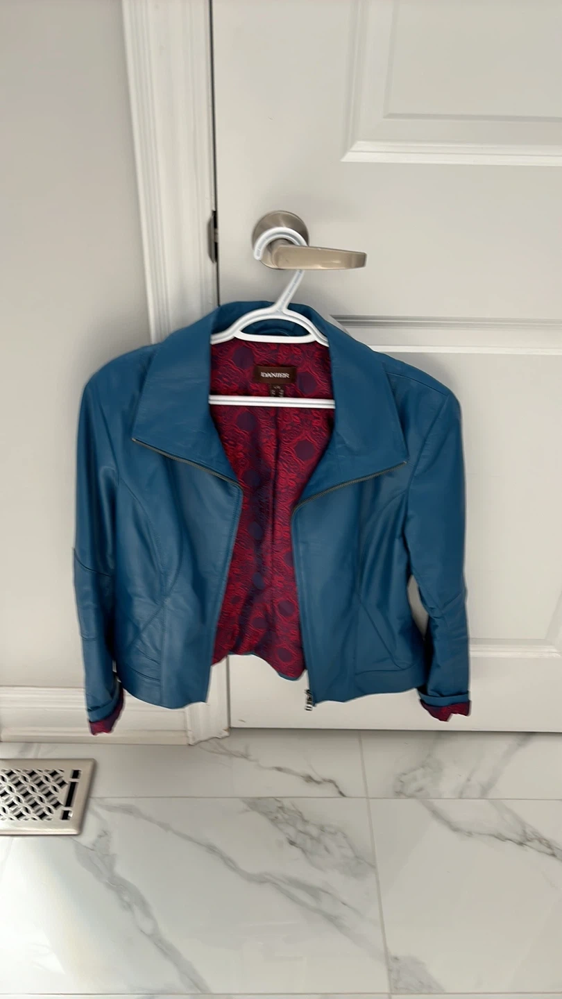 Looking to sell this beautiful teal leather jacket from Darnier It's a size 10 and features a stylish design with a unique patterned lining. The material is soft and comfortable, perfect for adding a pop of colour to your wardrobe!