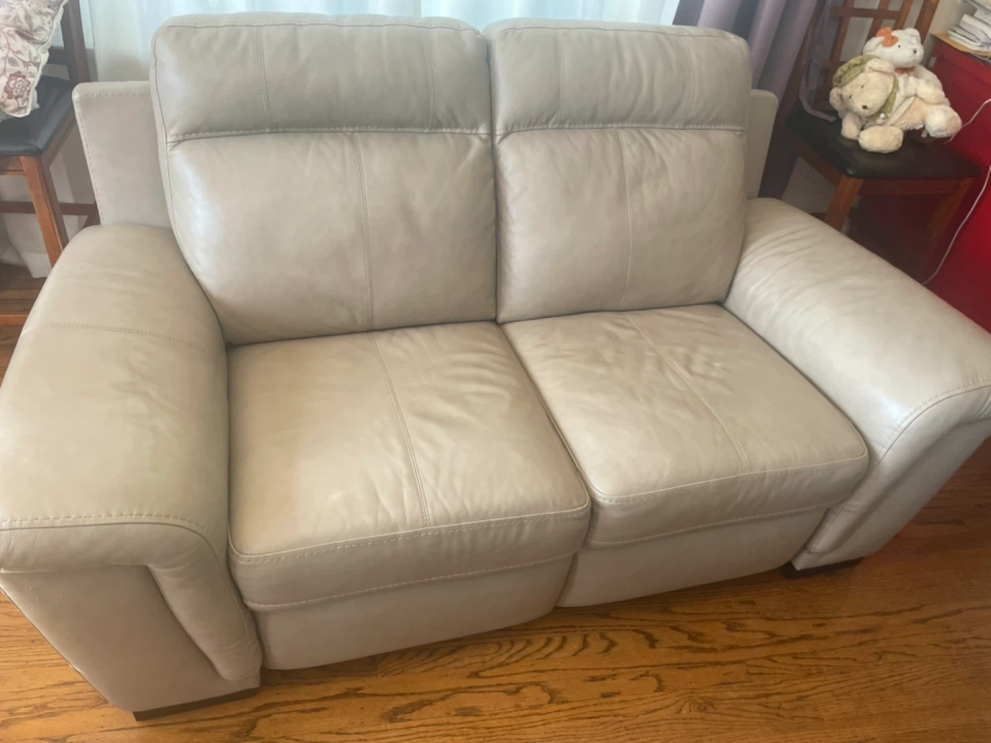 Selling a beige leather loveseat recliner. It's in good condition and perfect for a cozy living room setup. The recliner function works smoothly, making it a great spot to relax after a long day.