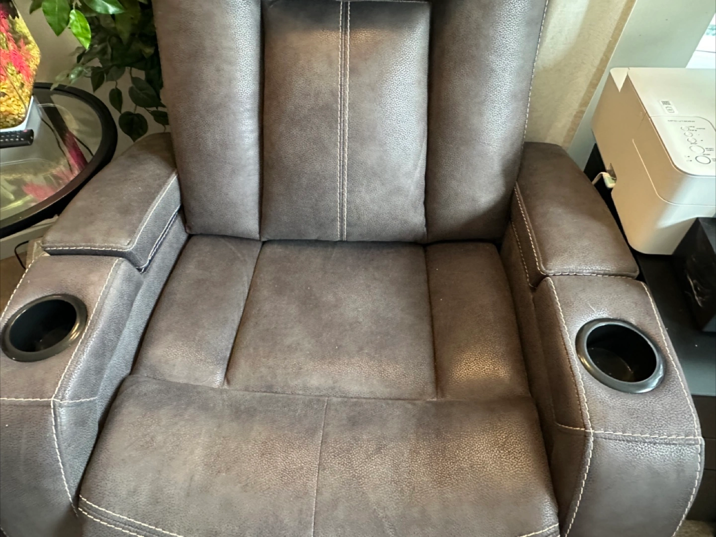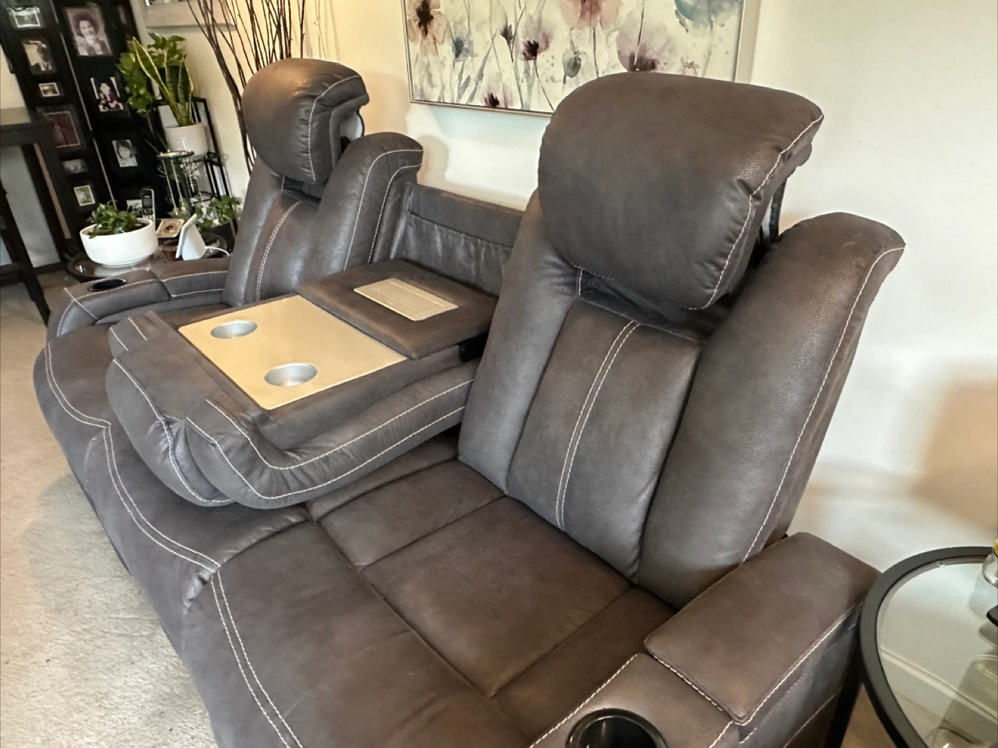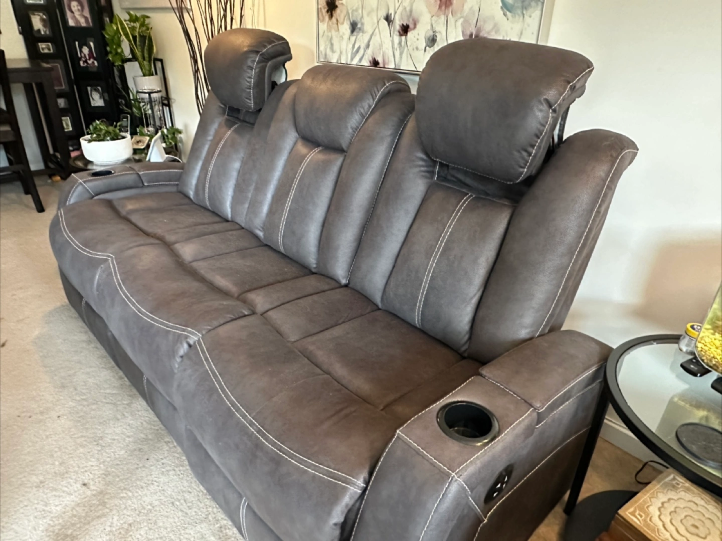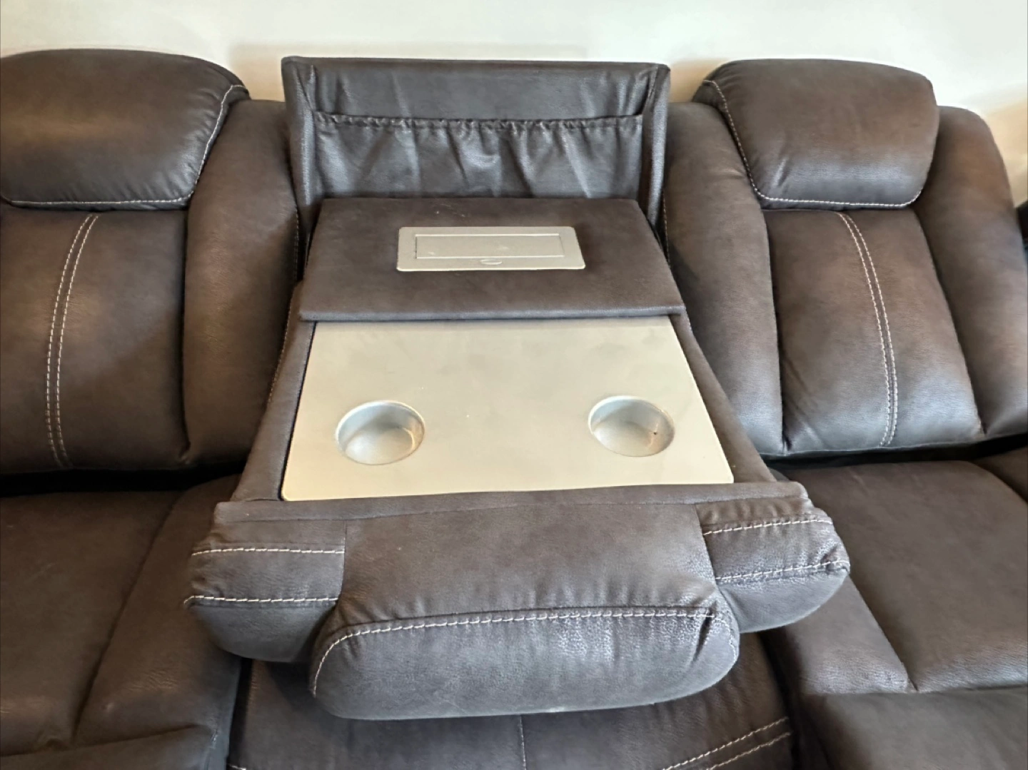 Selling a comfy leather reclining sofa! It features a convenient console in the middle with cupholders, perfect for movie nights or relaxing with friends and family. The seats recline for ultimate comfort. It's in great condition and ready for a new home!