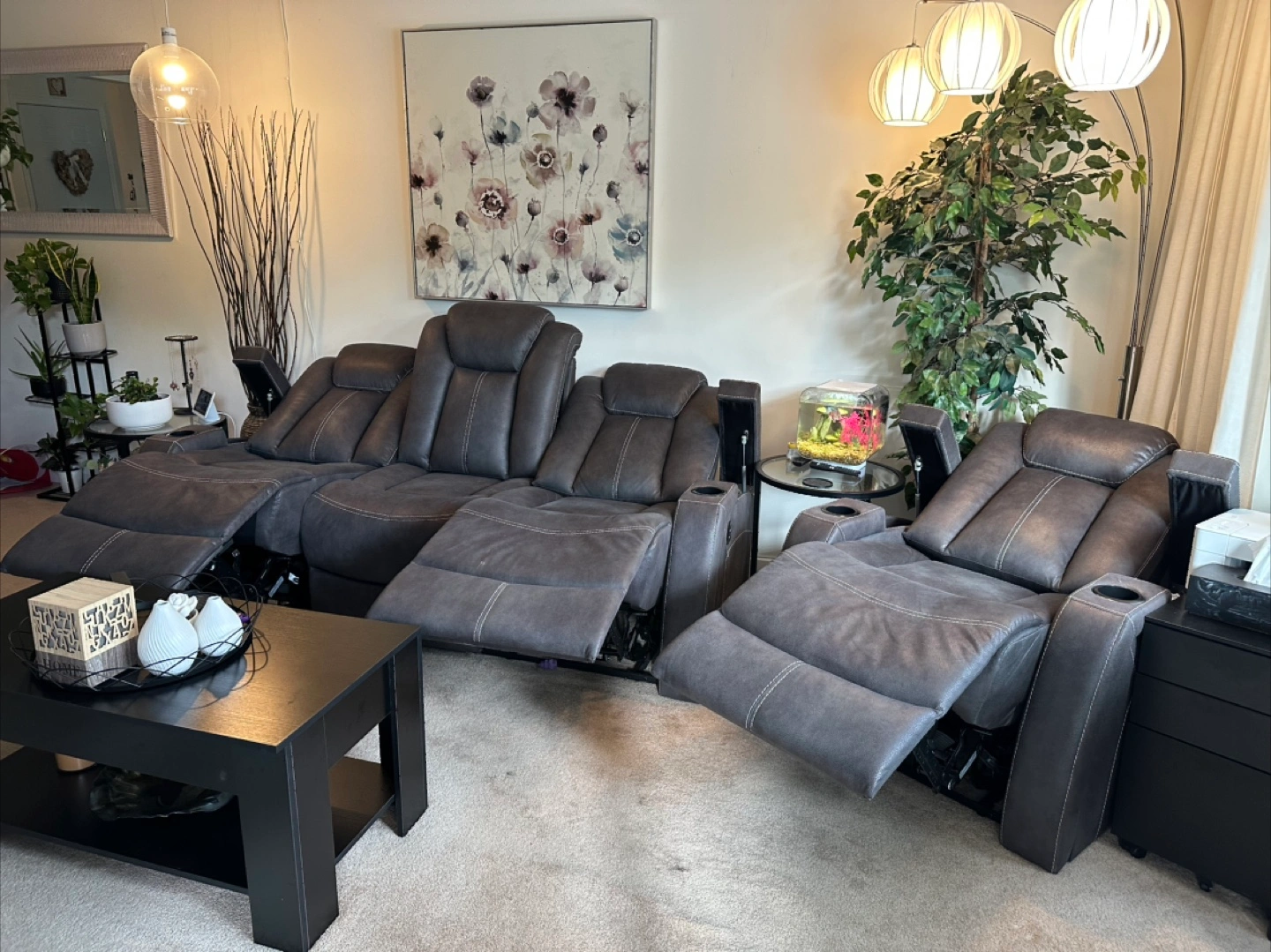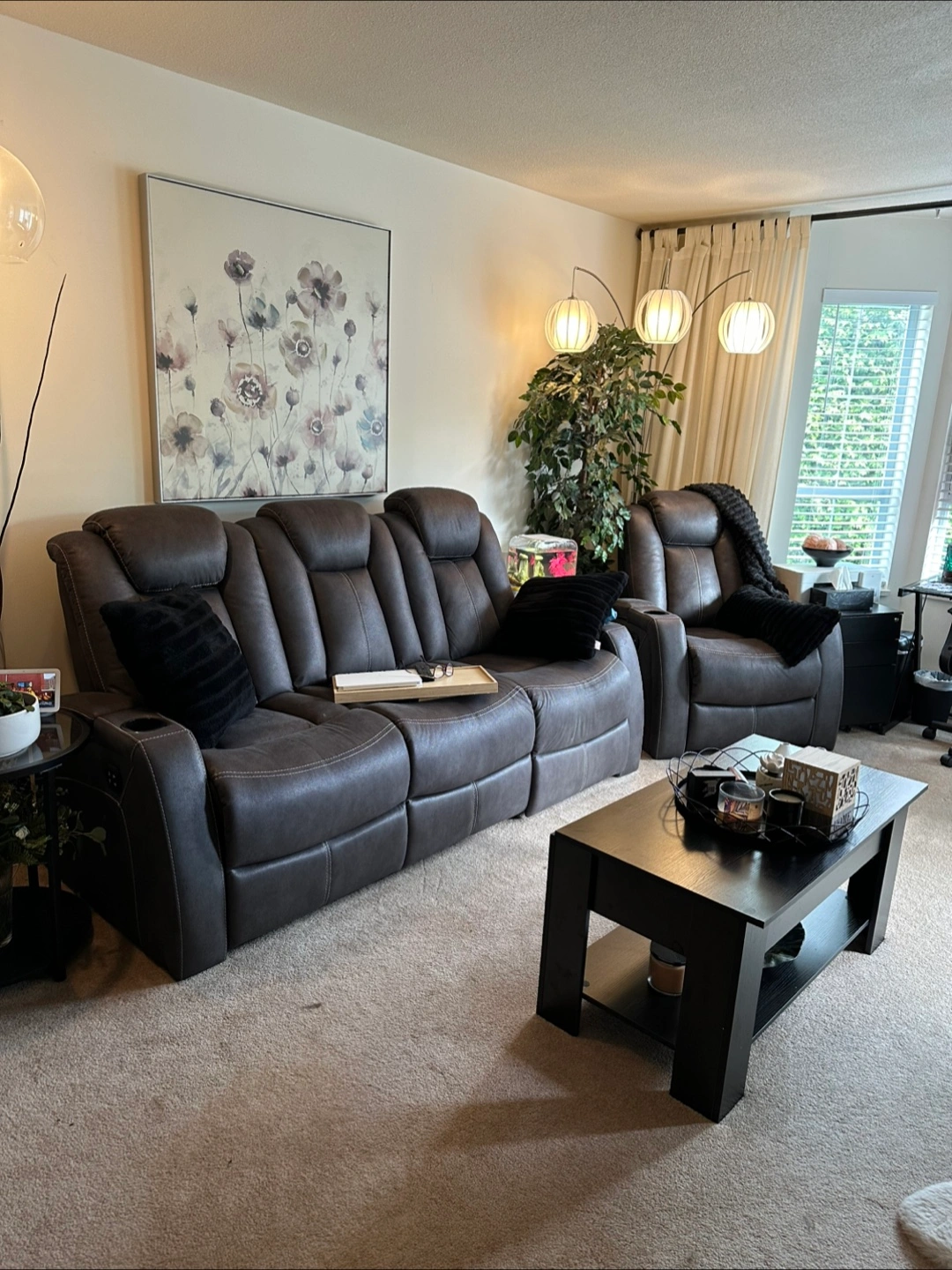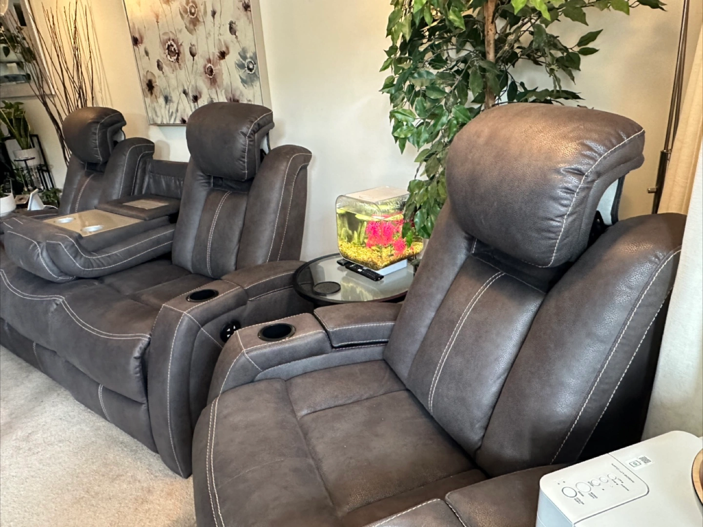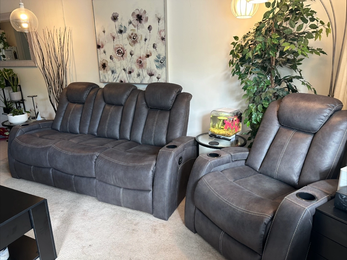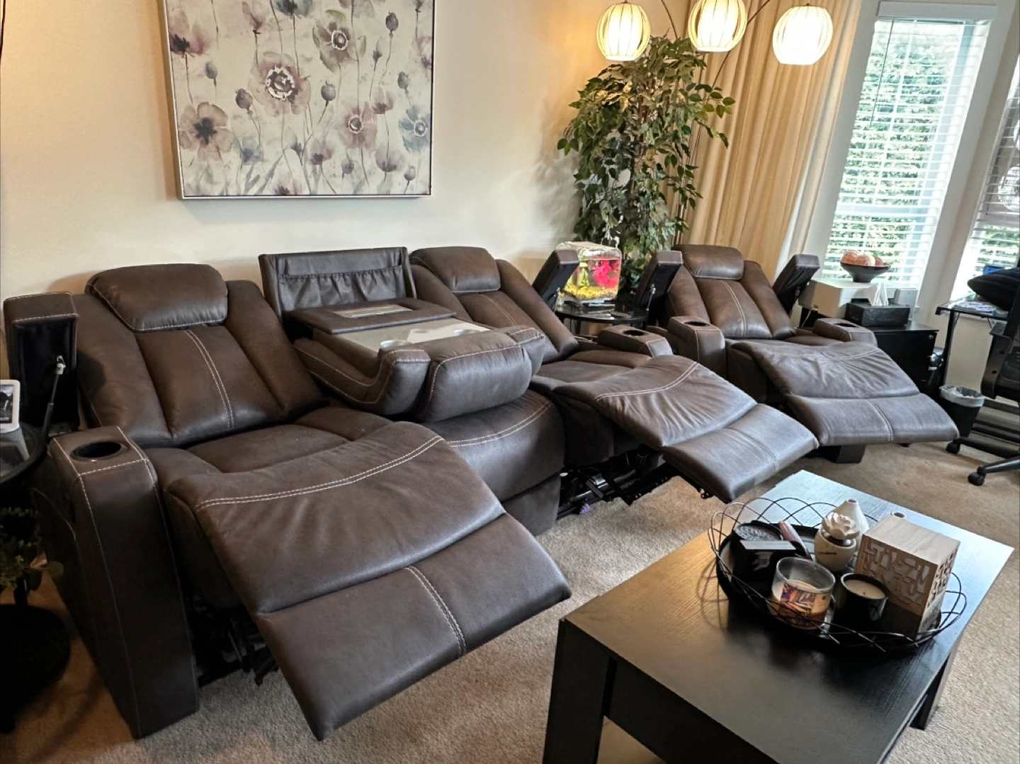Selling a comfy leather reclining sofa! It features a convenient console in the middle with cupholders, perfect for movie nights or relaxing with friends and family. The seats recline for ultimate comfort. It's in great condition and ready for a new home!