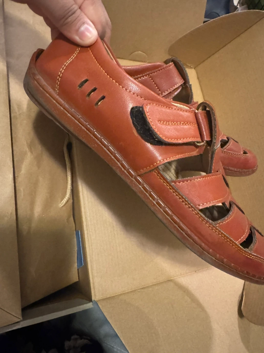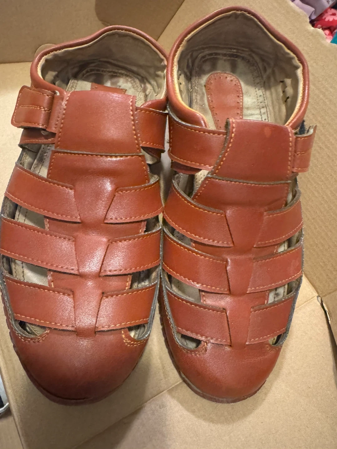 Selling a pair of leather sandals in size 9. They are in good condition and they are hand made. The sandals are a unique style and perfect.
