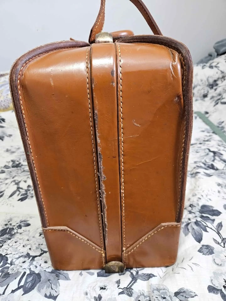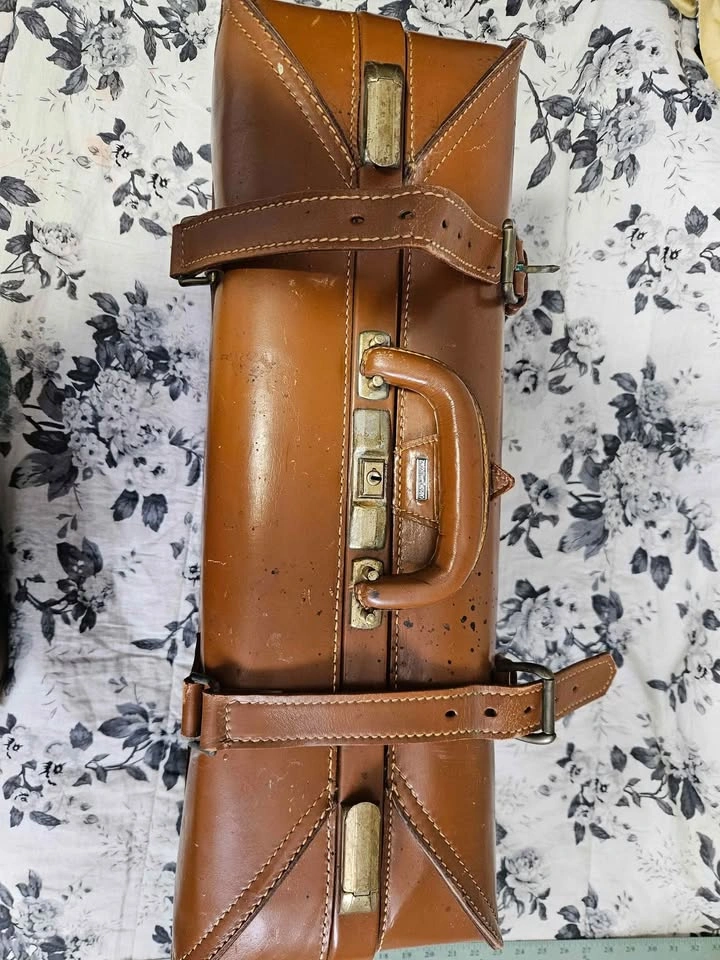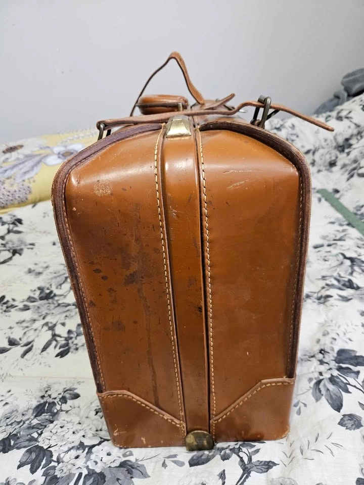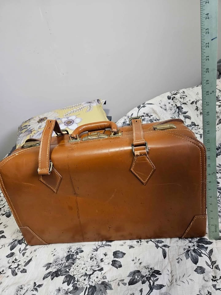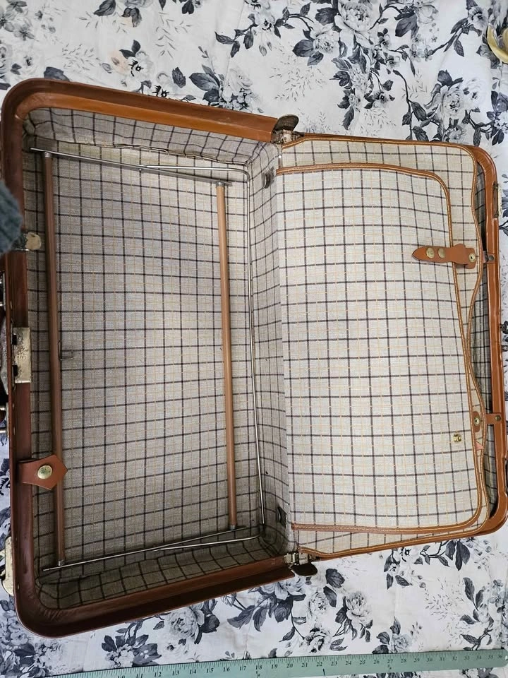 Vintage leather carson luggage. Used condition. Pictures of imperfections/staining will be shown in this listing. Comes with a Kenmore electric travel accessory I think it's a hair dryer but I'm unsure. It also comes with the original hanger.