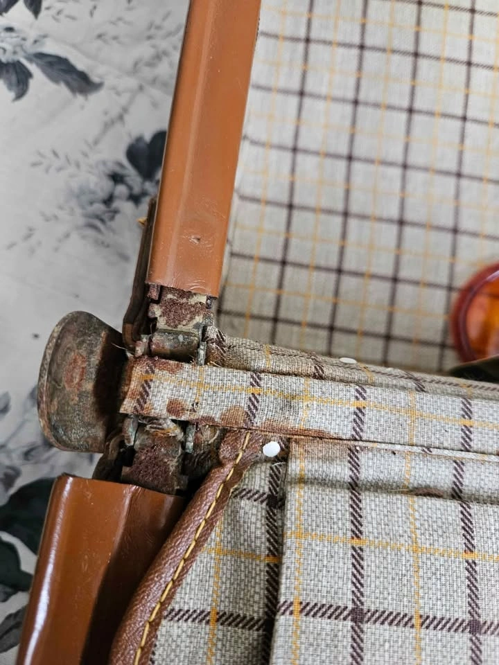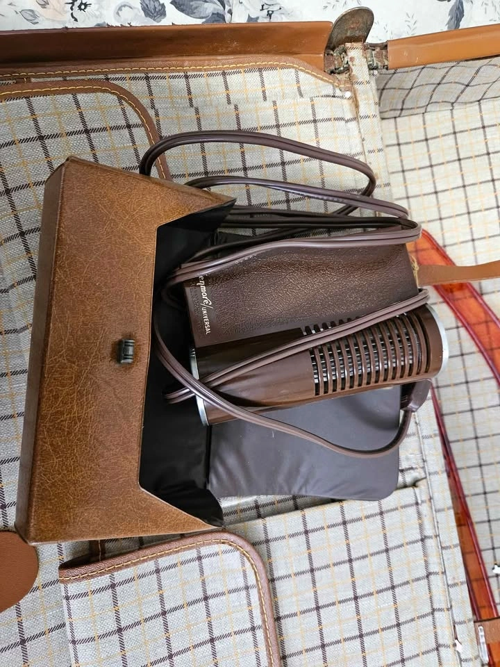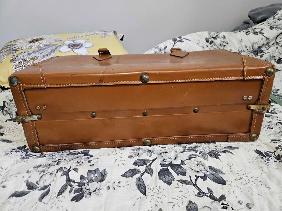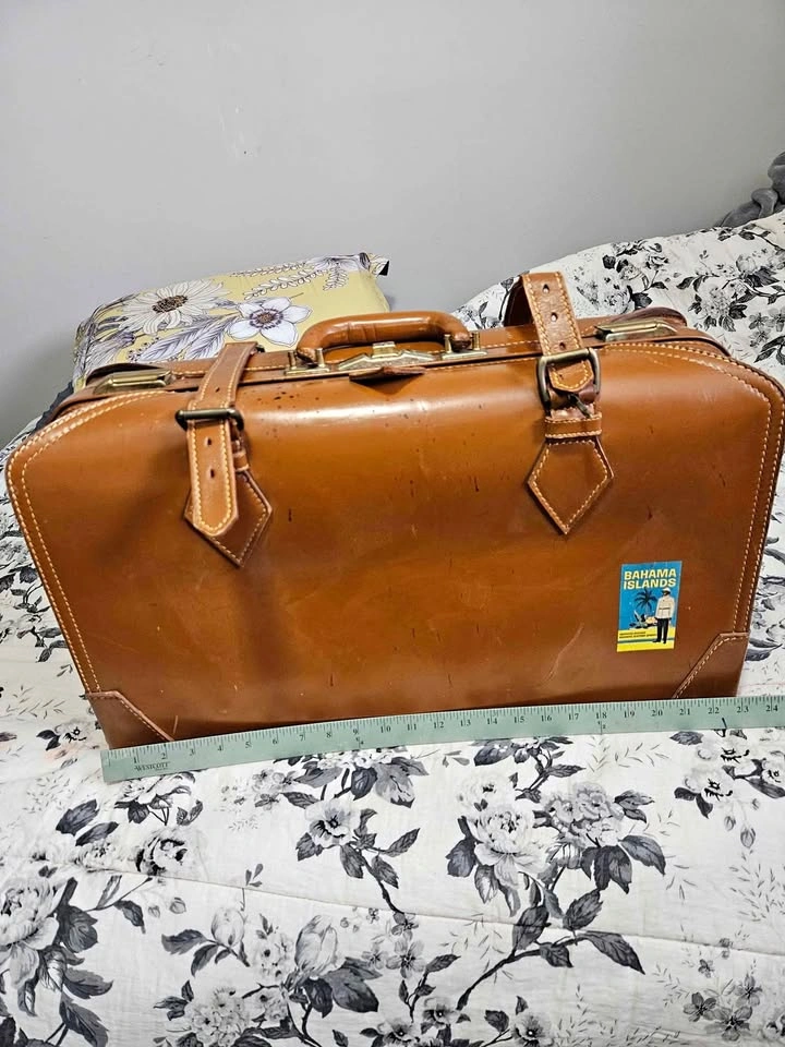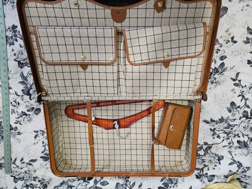 Vintage leather carson luggage. Used condition. Pictures of imperfections/staining will be shown in this listing. Comes with a Kenmore electric travel accessory I think it's a hair dryer but I'm unsure. It also comes with the original hanger.