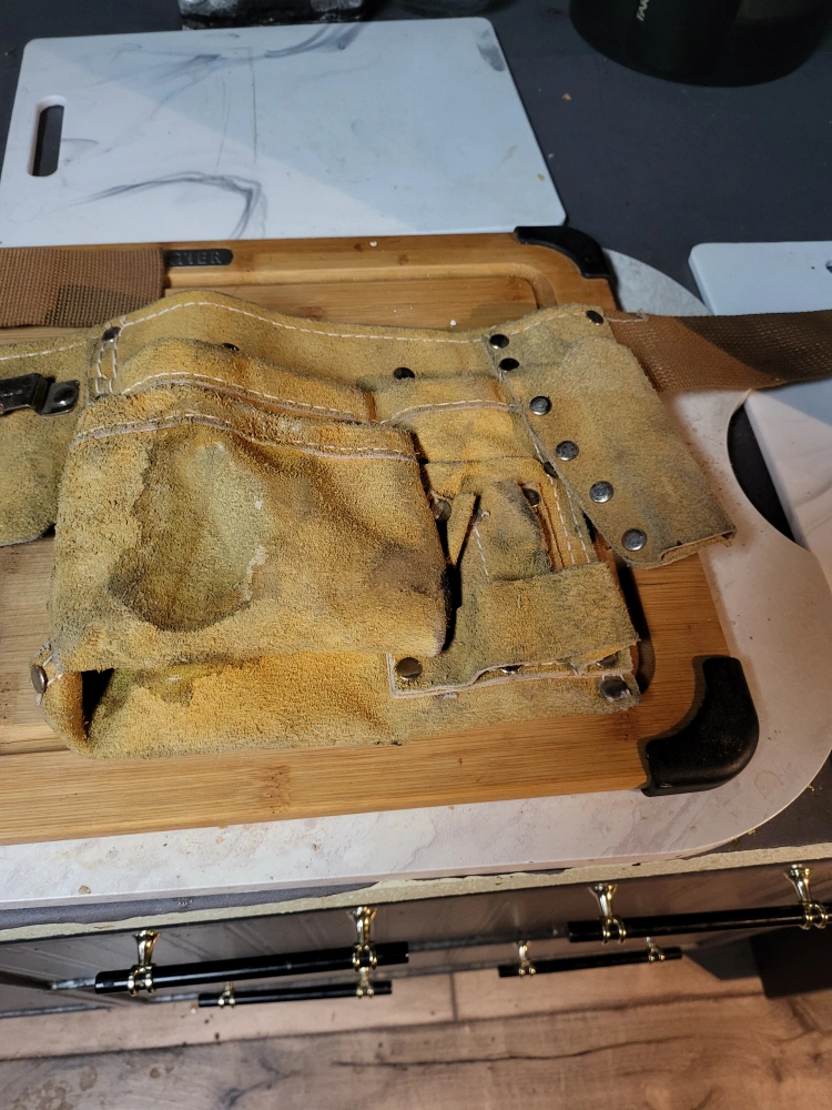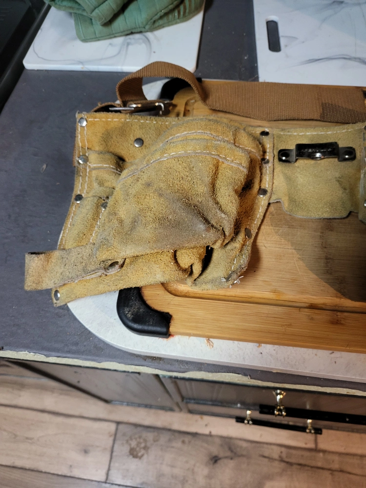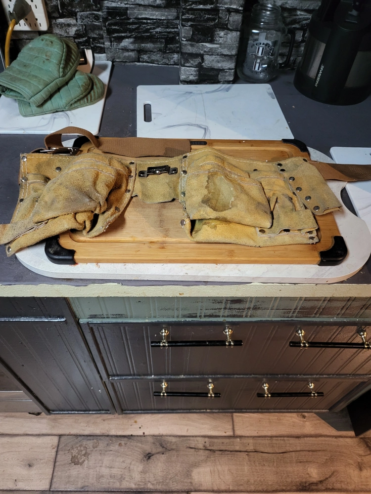Selling a used leather tool belt. It has multiple pockets for storing tools and fasteners. Shows signs of wear but is still functional and ready for use on your next project