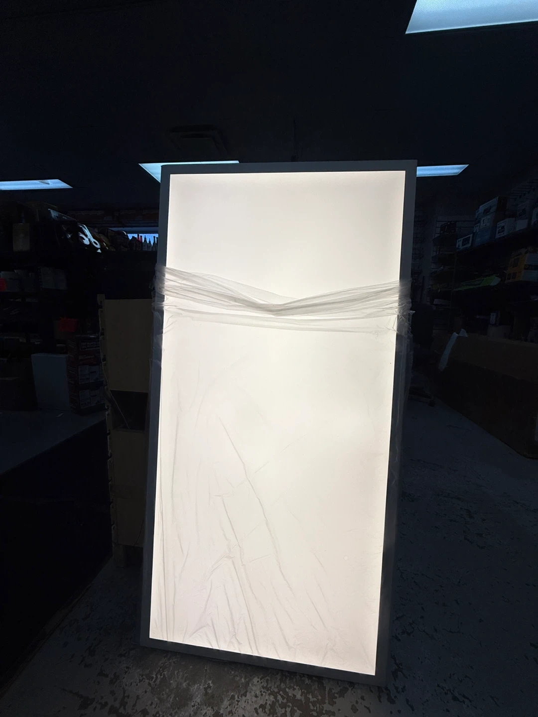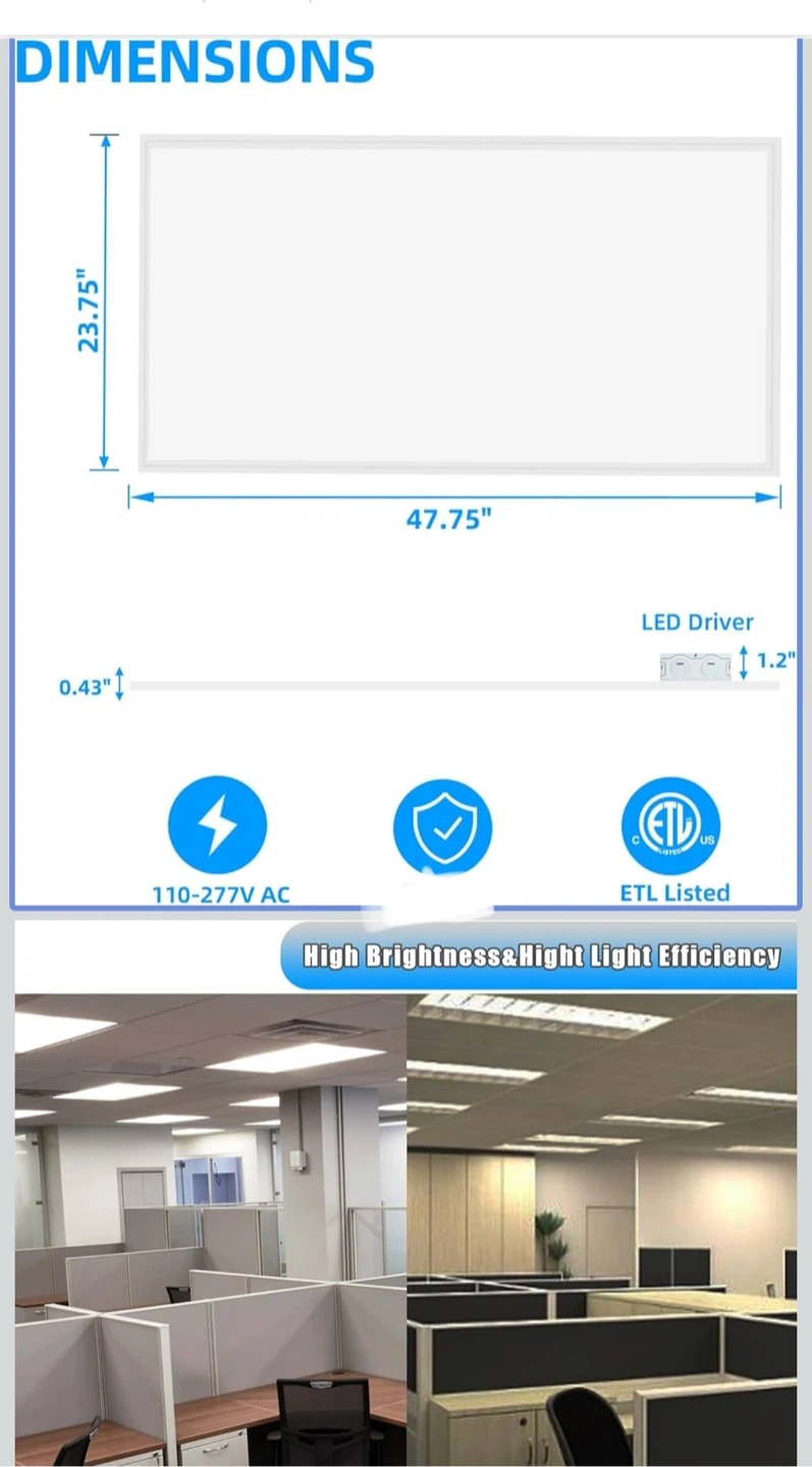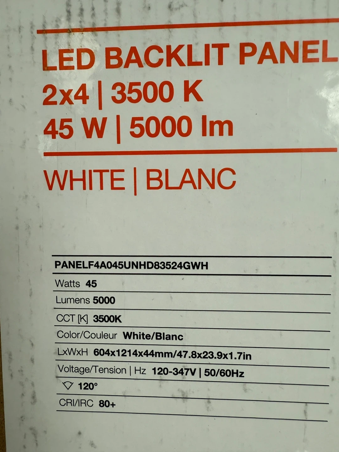 Selling a LED Backlit Panel, size 2x4. It's white and emits 5000 lumens at 3500K. It's 45W and operates at 120-347V/50/60Hz. Dimensions are 604x1214x44mm / 47.8x23.9x1.7in