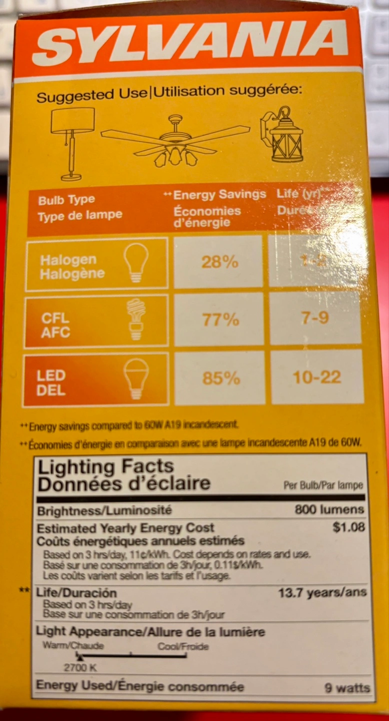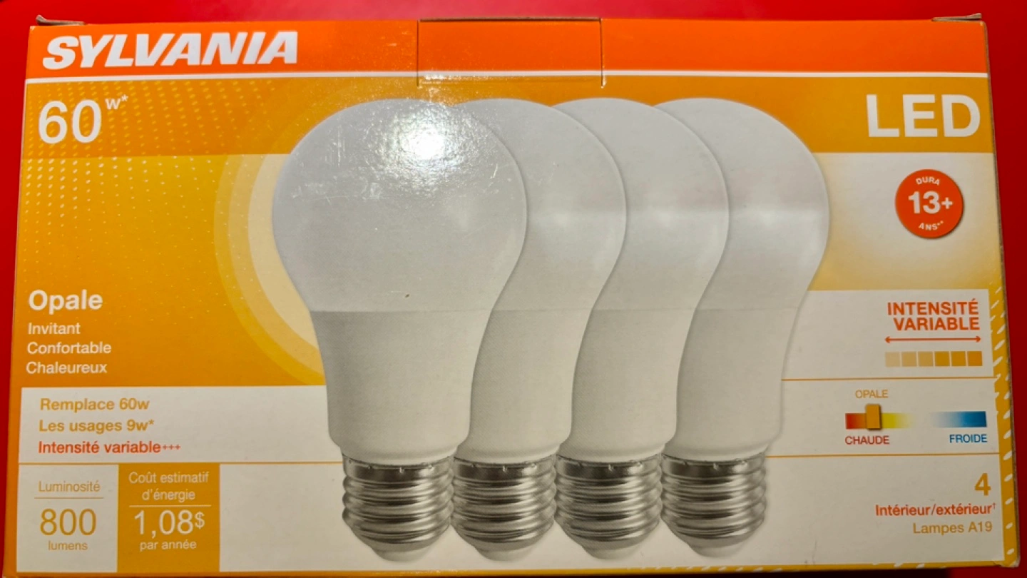 Selling a brand new pack of Sylvania 60W LED bulbs. These are soft white and dimmable. Each bulb provides 800 lumens of brightness while only using 9 watts of energy. They are rated to last 13+ years, and the pack contains 4 bulbs. Great for indoor or outdoor use!