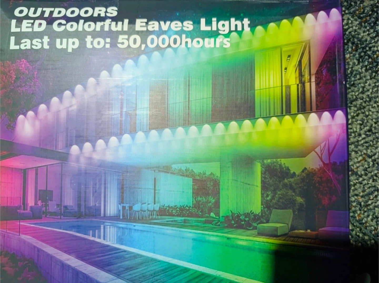 Brand new never used Outdoor LED Colorful Eaves Light, perfect for adding some flair to your outdoor space! It lasts up to 50,000 hours and includes a remote control for easy colour adjustments. Comes with all the components in the box.