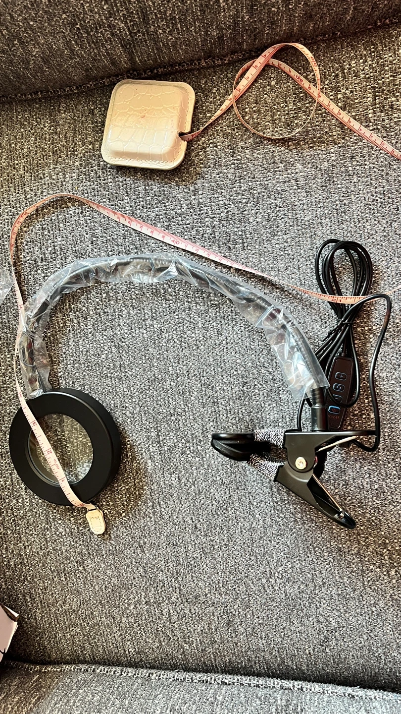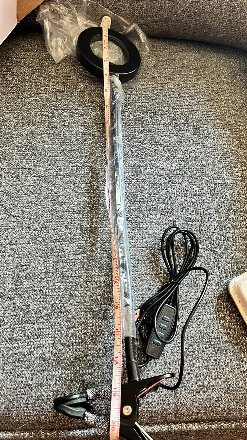 Selling a handy LED desk lamp with magnifying glass and with a clamp, perfect for a variety of uses! It's black and features an adjustable gooseneck design so you can position the light exactly where you need it. The clamp allows you to easily attach it to desks, shelves, or other surfaces. Great for reading, crafting, or working from home