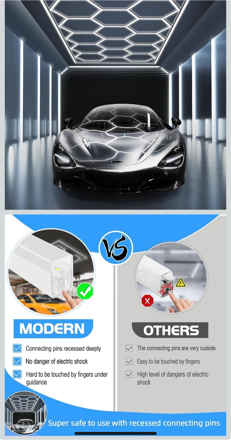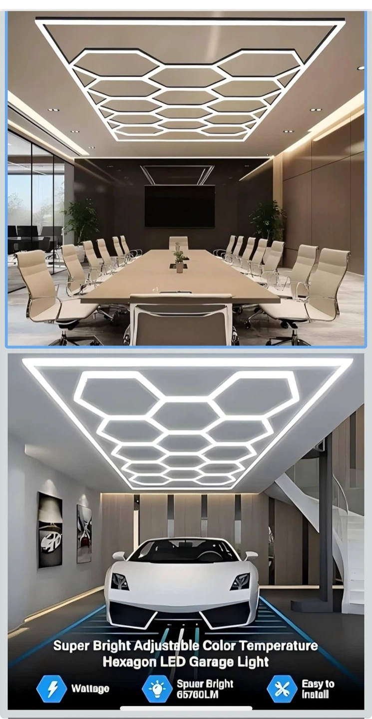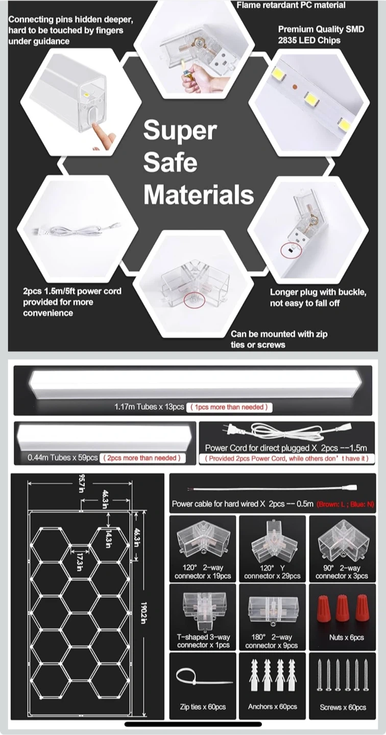 Add a modern touch to your garage or workspace with these LED garage lights! Featuring a unique hexagon design, they provide super bright, adjustable colour temperature lighting. Easy to install with included zip ties or screws. The kit includes everything you need: tubes, connectors, zip ties, anchors, and screws