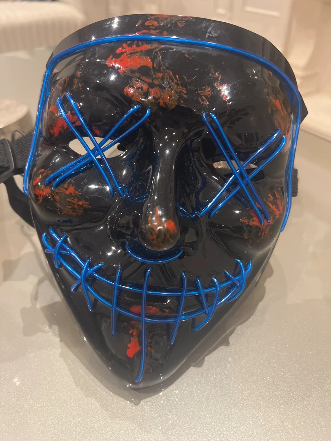 Selling a used LED Purge Mask. It features blue LED lights and a black mask with red accents. Great for Halloween or parties!