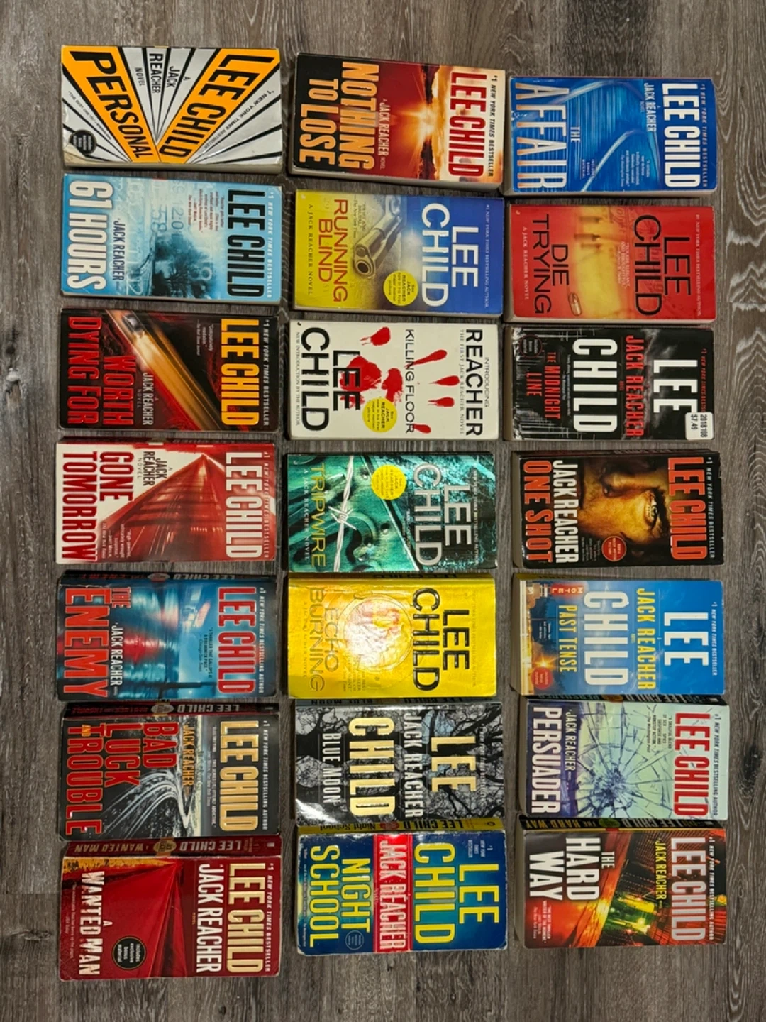 Selling a collection of Lee Child's Jack Reacher novels! All books are in great condition and ready for a new home. Titles include Personal, Nothing to Lose, The Affair, Die Trying, Running Blind, Killing Floor, The Midnight Line, One Shot, Past Tense, Persuader, The Hard Way, Echo Burning, Tripwire, Blue Moon, Night School, Gone Tomorrow, The Enemy, Bad Luck and Trouble, Wanted Man, 61 Hours, Dying for Worth. Will not split Pick up Sage Hill Smoke and pet free home Cash only Please check out my other listings