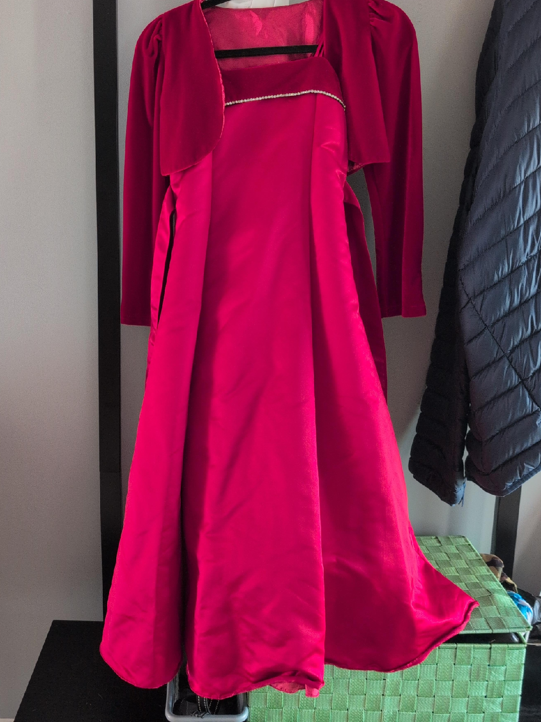 Selling a beautiful red dress with a matching bolero from Leeying Bong! It's a size 12 and features a lovely bow detail at the back. Perfect for a special occasion! jacket is velvet with a silk lining. dress is fully lined with a touch of crinoline at the bottom for a little flare. very comfortable to wear according to my daughter.