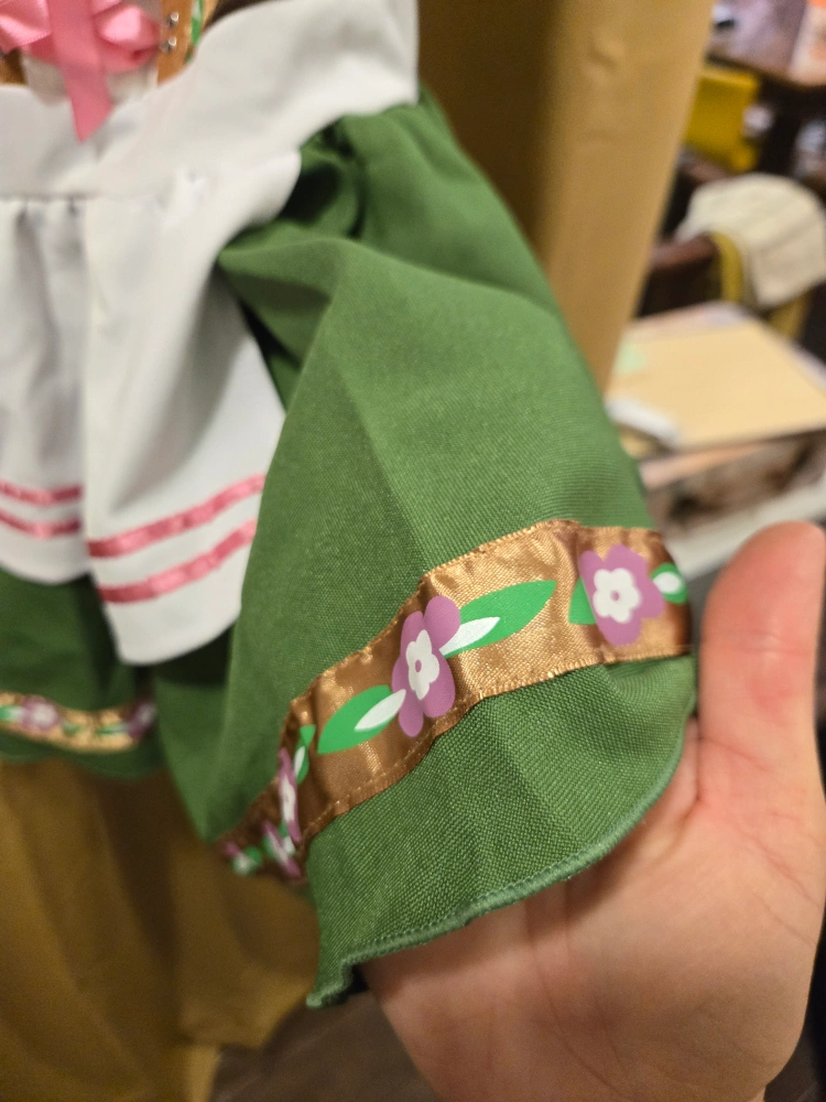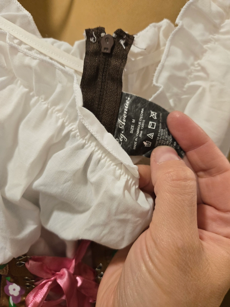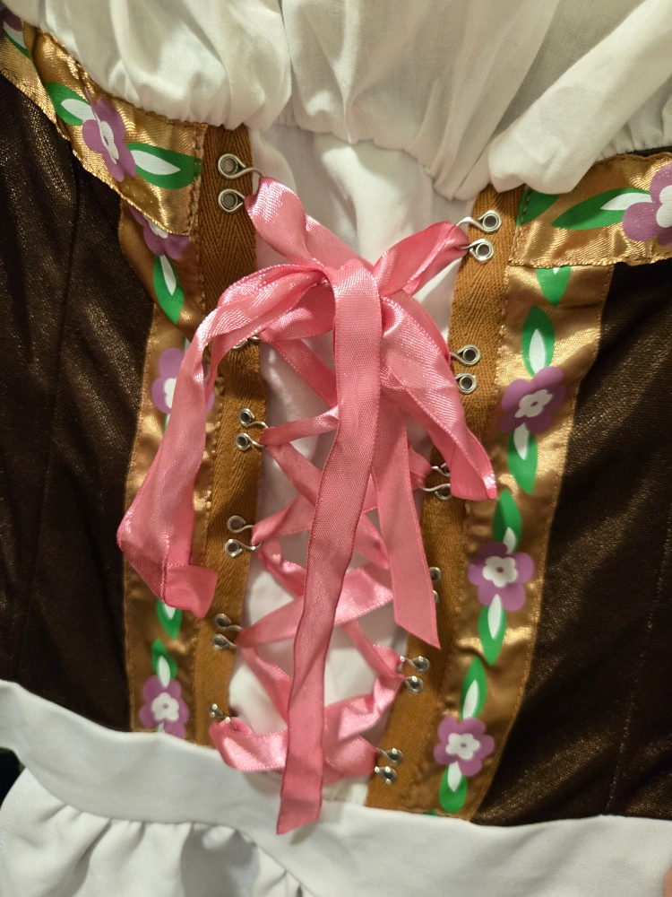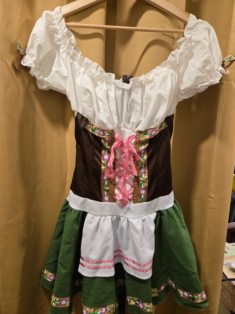Selling a Leg Avenue dirndl costume in size medium. It's a cute, traditional-style dress perfect for costume parties or themed events. The dress features a white top, brown bodice with pink ribbon lacing, and a green skirt with floral detailing. The brand is Leg Avenue and the size is M.