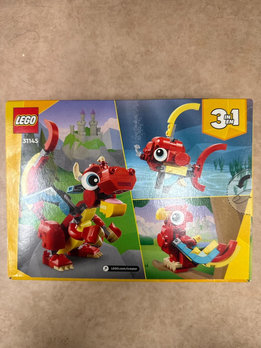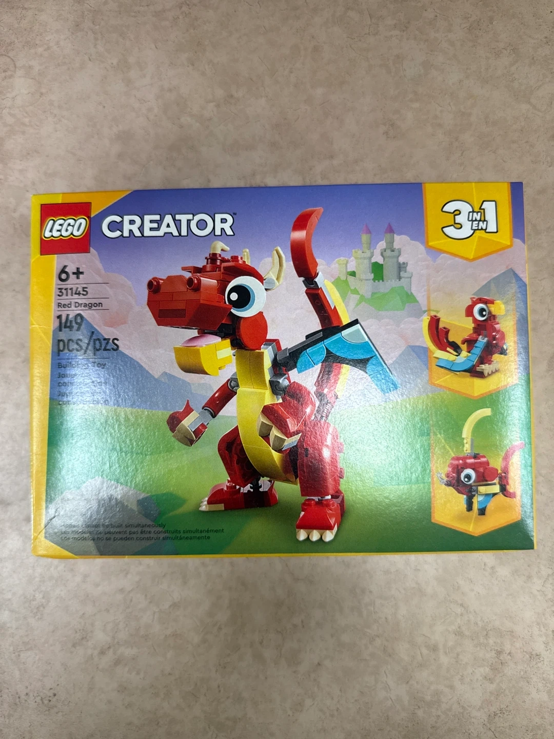 Selling a brand new, unopened LEGO Creator 3in1 Red Dragon set (31145)! This set lets you build three different creatures: a red dragon, a phoenix, or a fish. Perfect for LEGO fans aged 6 and up. It contains 149 pieces for lots of creative fun