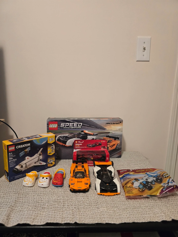 Selling a variety of Lego sets! Includes: - Lego Creator set (6+ 144 pcs) - Lego Speed Champions sets (Ferrari, McLaren) - Lego Dragons Rising set (6+ 55 pcs) - Shell Ferrari F1-75 - McDonalds Crocks key Chain 3 pieces