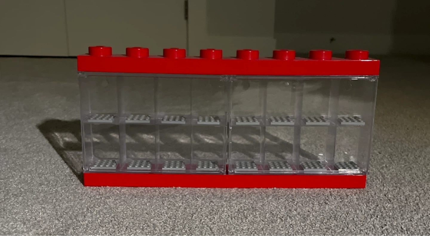 Selling a LEGO Minifigure Display Case in red. It's perfect for displaying your favourite minifigures. It has a clear case with shelves inside. Great condition!