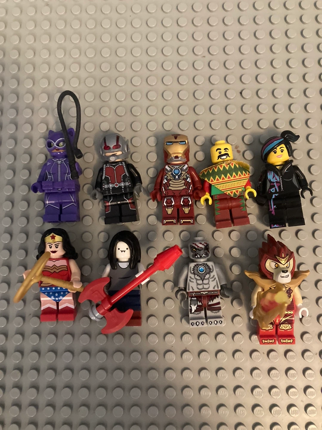 $10 Cat Woman $25 Ant Man $25 MK17 Iron Man $10 Taco Tuesday Guy missing hat $5 wild style $10 Wonder Woman $40 Adventure Time Marceline Lego Chima $6 for both
