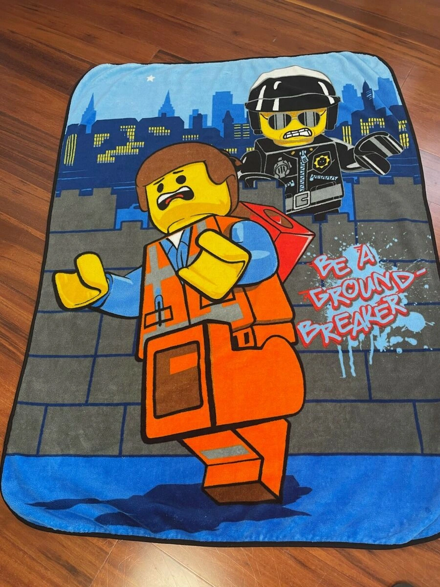 Soft fleece throw blanket. Features Emmet and a police officer from The LEGO Movie. Blue background with grey brick wall. Says "Be a Ground Breaker". cash preferred, no holds, must pick up