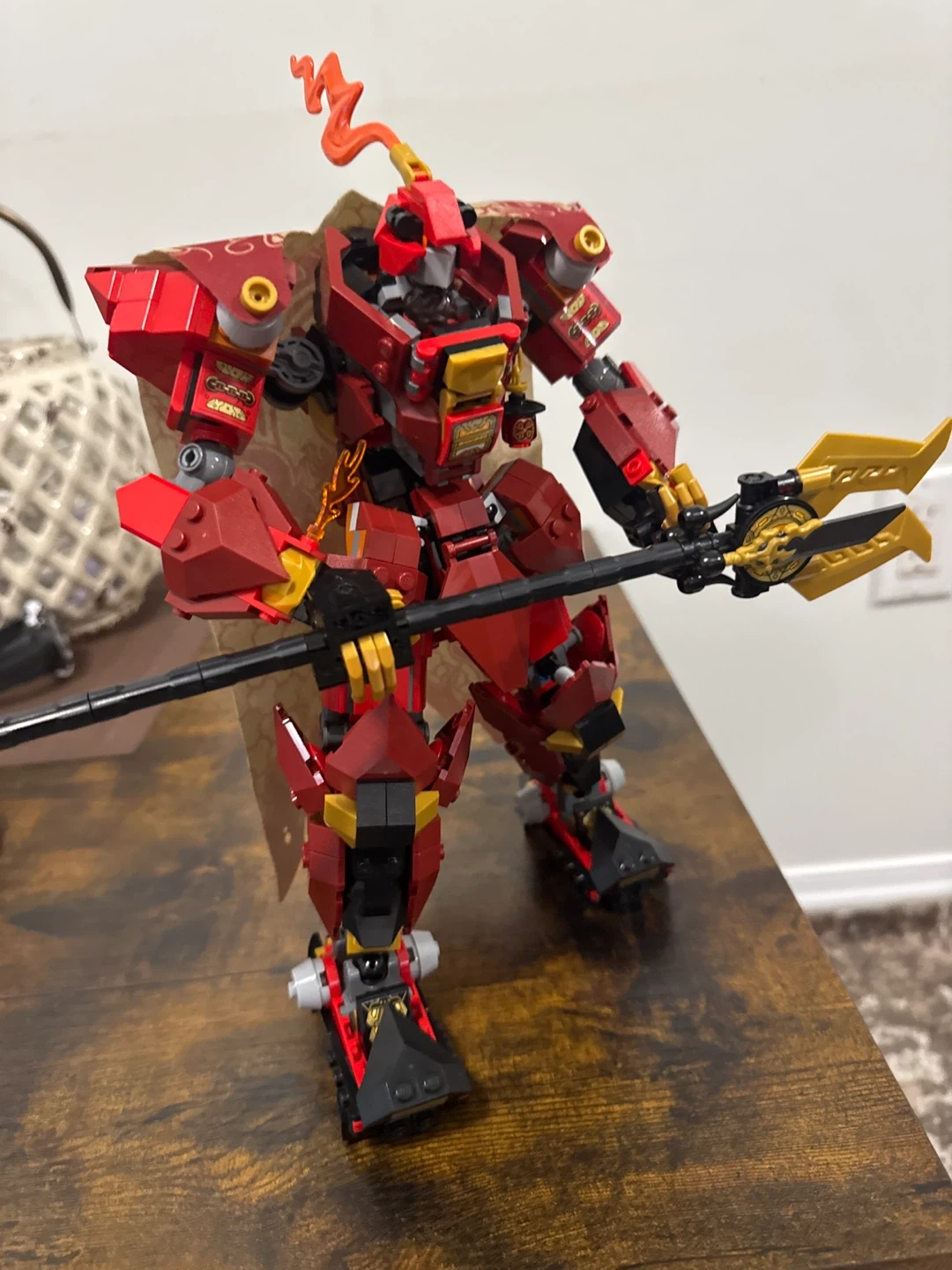 Selling a LEGO Ninjago Fire Stone Mech (71720). This set features a posable mech figure with a cockpit for minifigures and a large golden spear. Great for Ninjago fans and LEGO collectors!