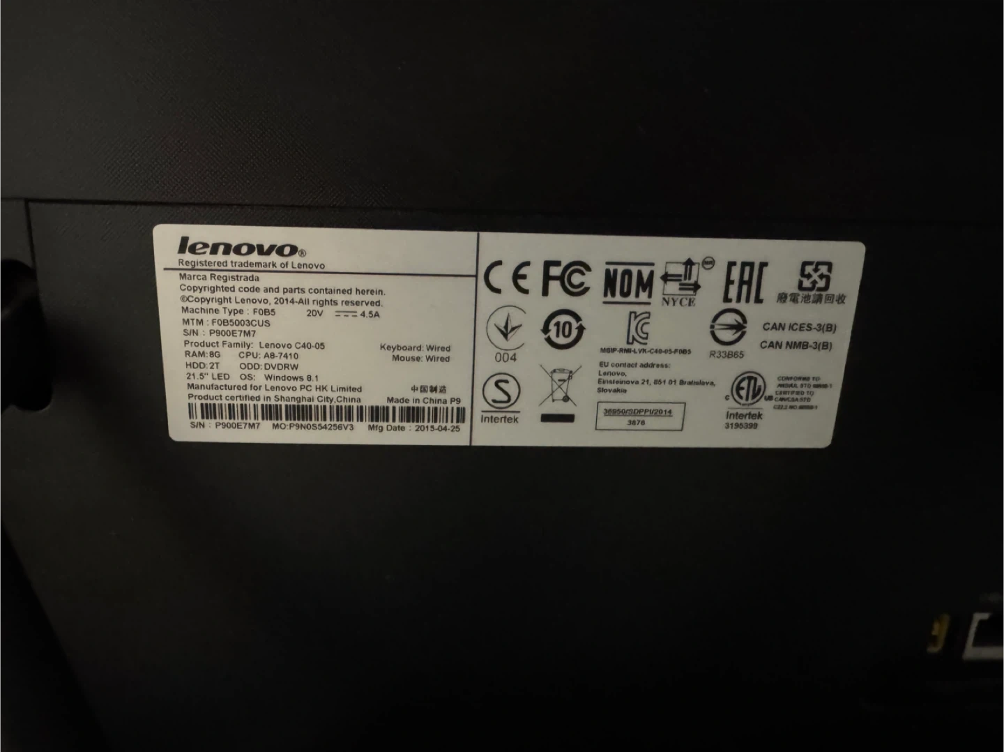 Selling a Lenovo all-in-one PC. Touch screen. The model number is F0B5003CUS. It has 8GB of RAM and a CPU A8-7410. The manufacturing date is 2015 April 25 In good condition.. selling it cause i do not longer need a computer.