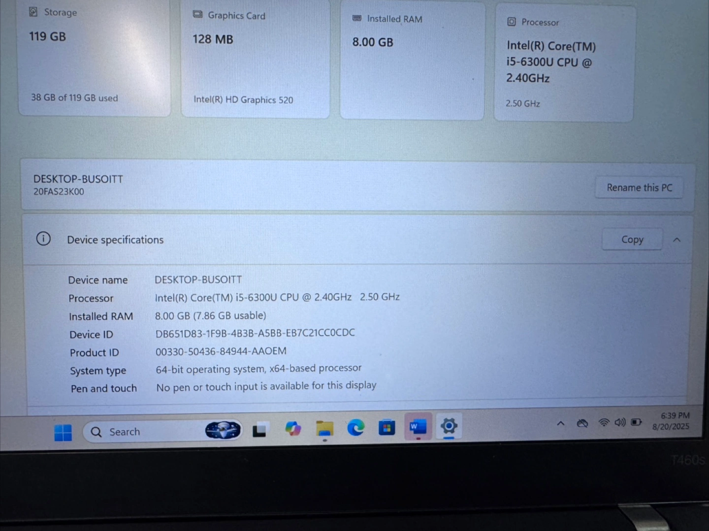 Selling a Lenovo ThinkPad T460s laptop. It comes with a charger. 8gb 128gb Win 11 Charger