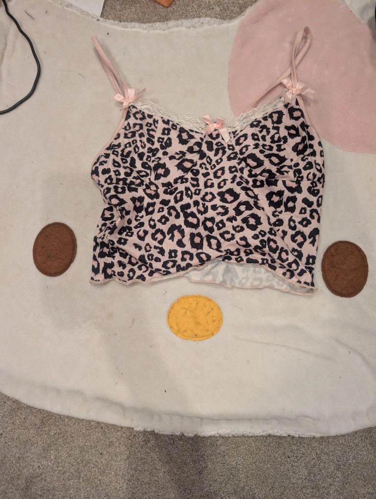 Cute cami top with a fun leopard print! It has little bows on the straps and lace detailing along the top. Perfect for layering or wearing on its own!
