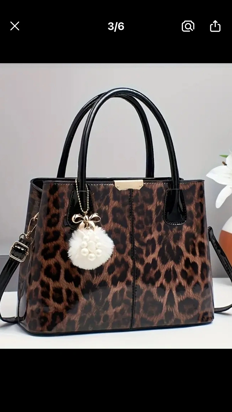 Stylish handbag with a leopard print design. It features black handles and trim, and a cute pompom charm. Perfect for adding a touch of flair to any outfit!