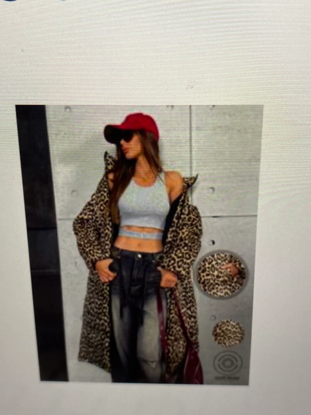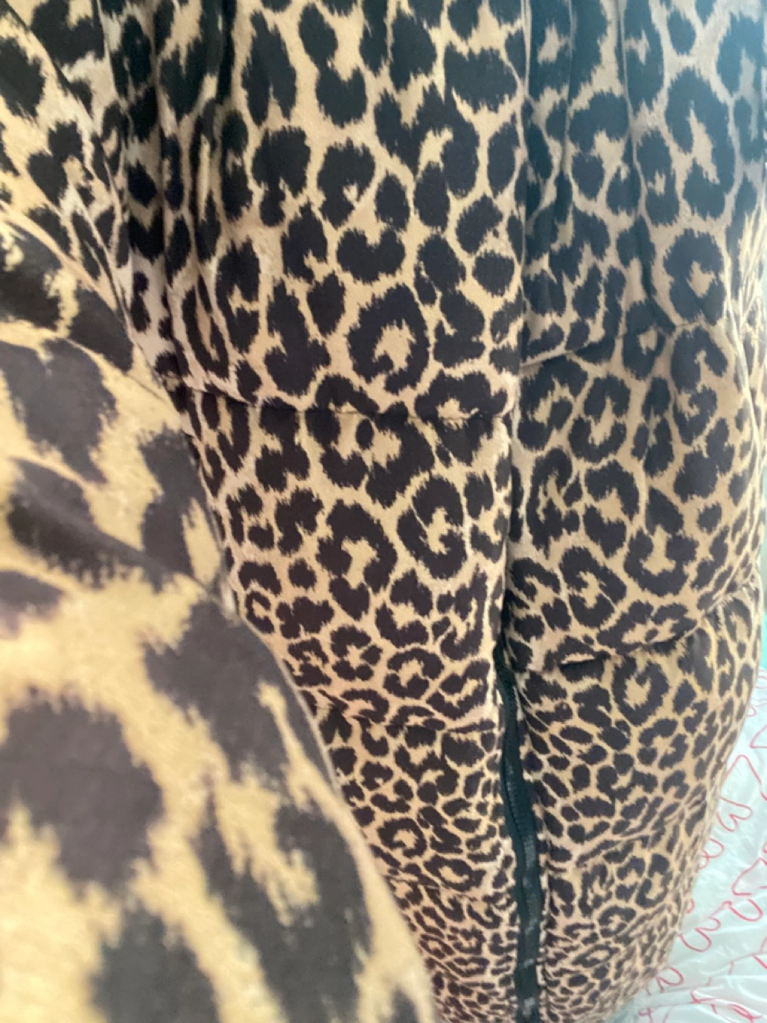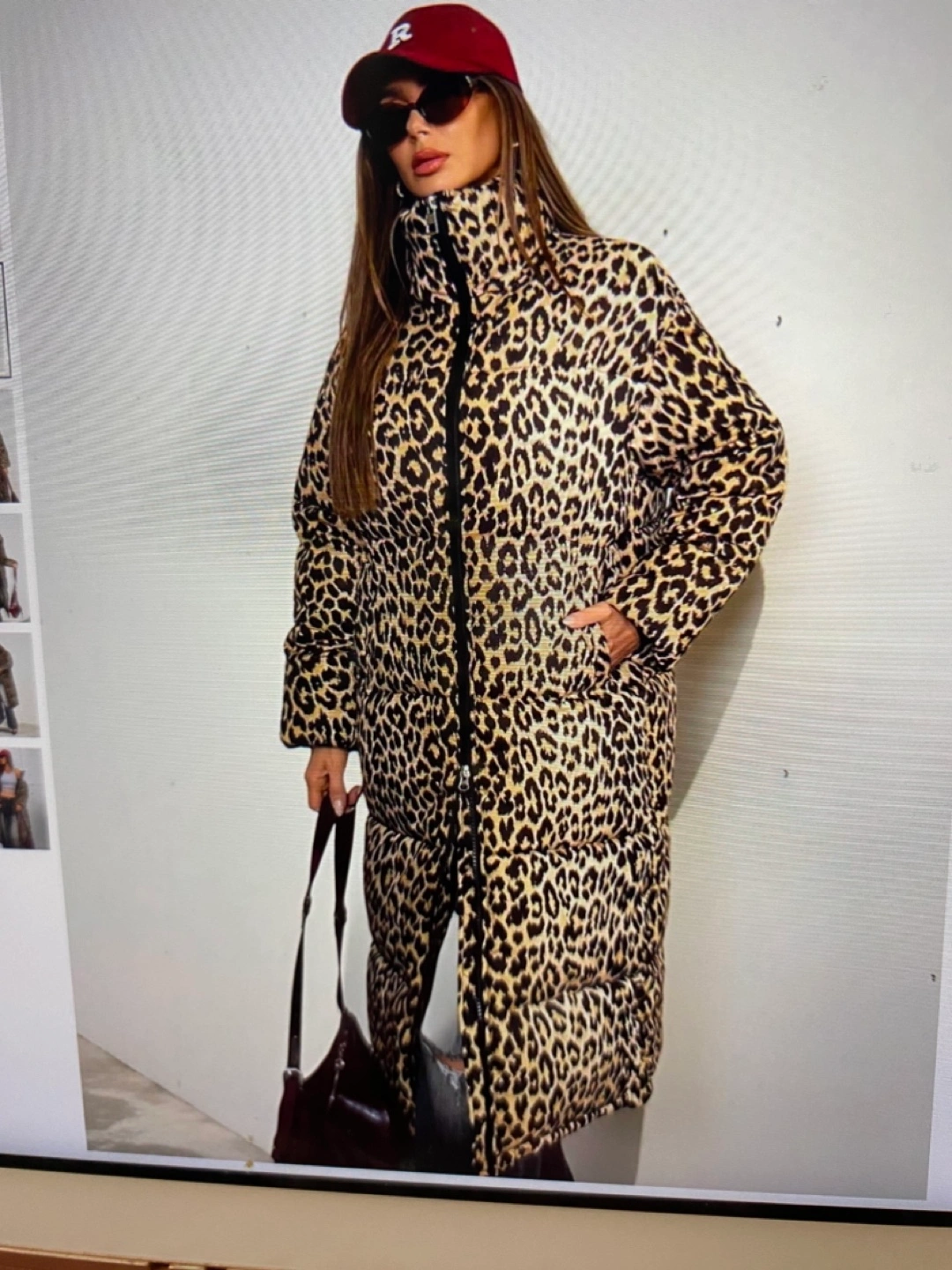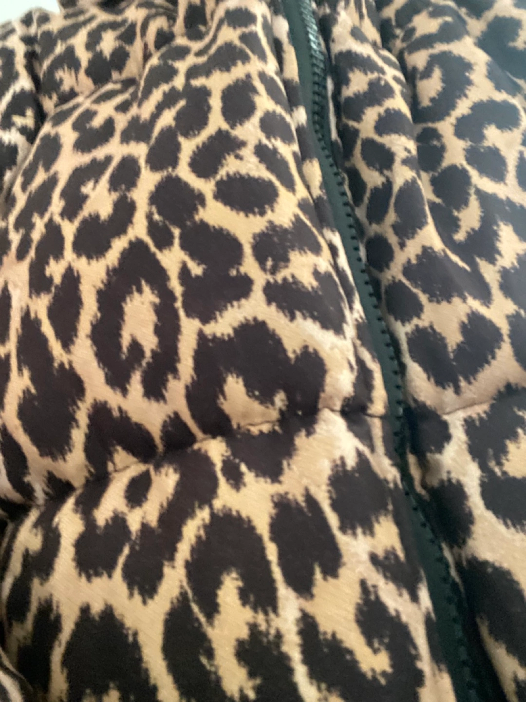 Long-length puffer coat. Features a high collar and zipper closure. Leopard print design. Warm and stylish. I love this coat - bought it in two sizes and kept the one that fits. Gets lots of compliments. Brand new, never worn