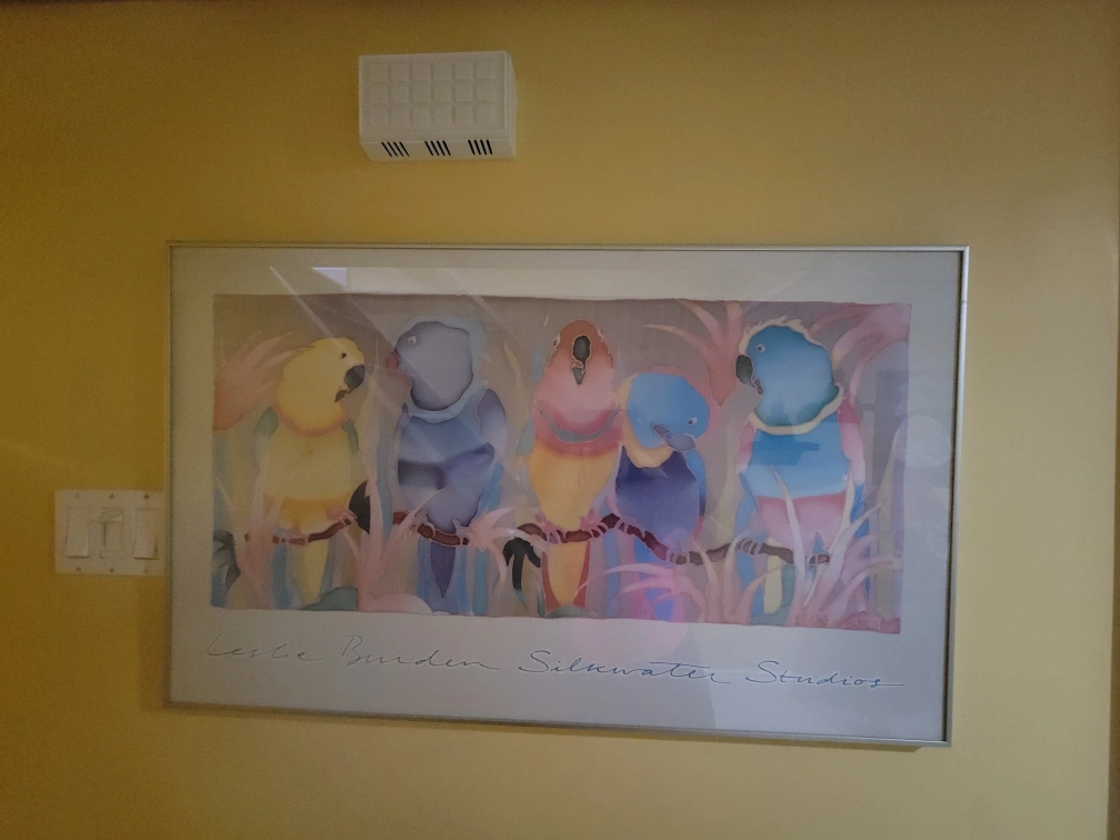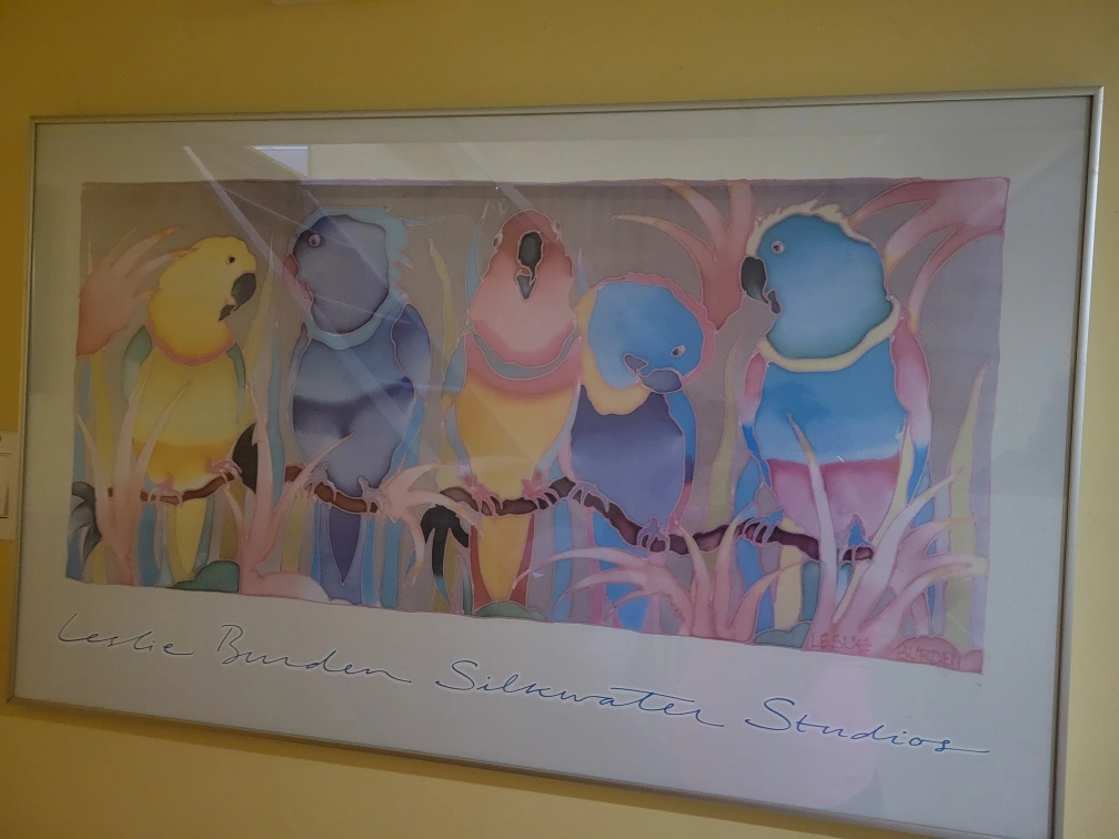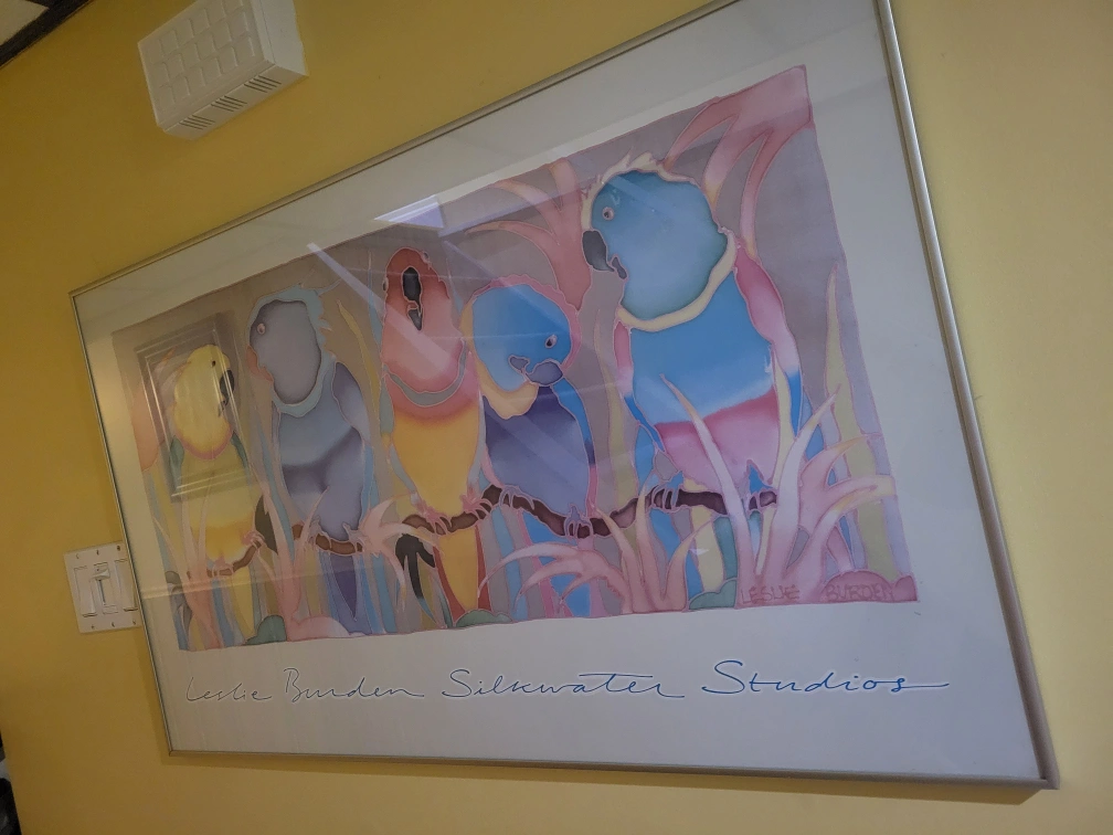 Framed art print by Leslie Burden of Silkwaters Studios featuring colourful birds