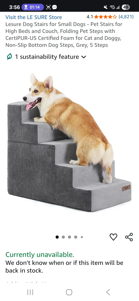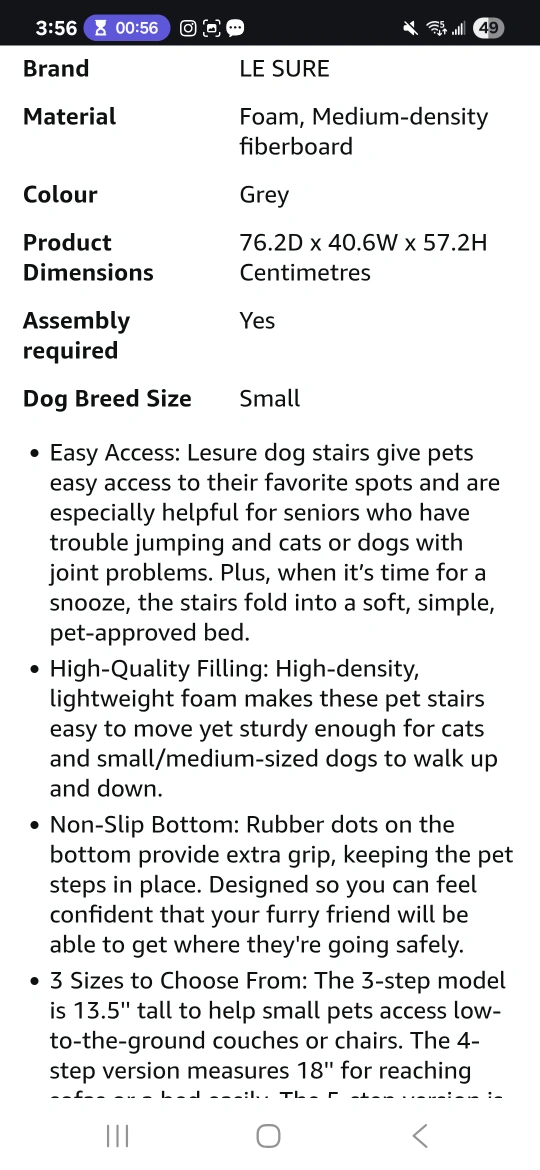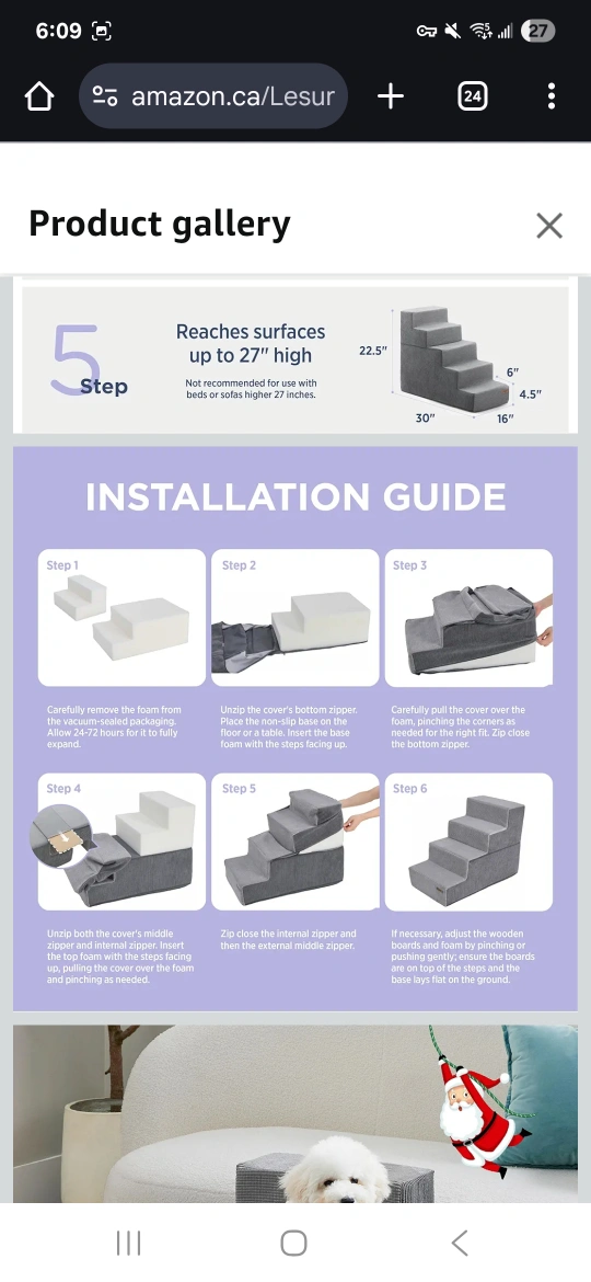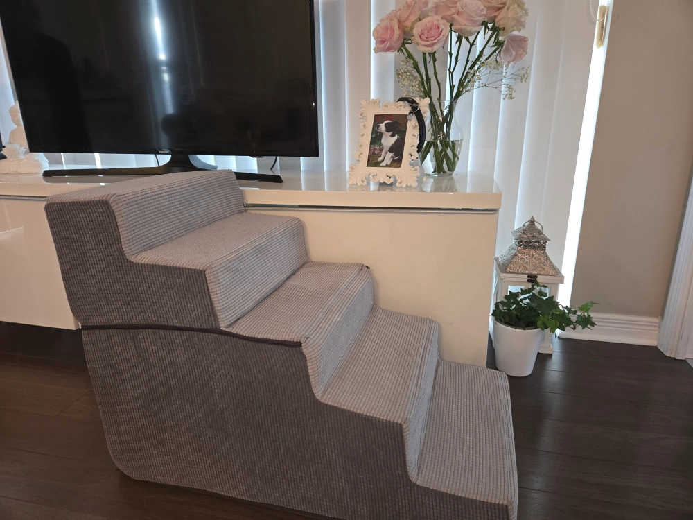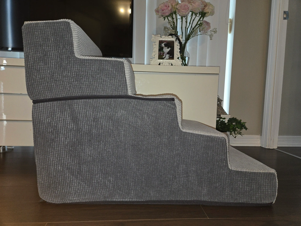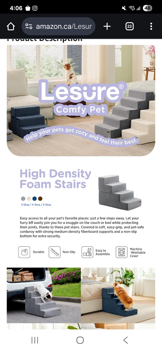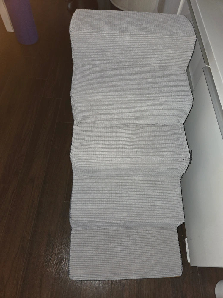 These are Lesure dog stairs with five steps, perfect for helping your furry friend reach high beds or couches! They're grey in colour and made of foam with a medium-density fiberboard. The dimensions are 76.2D x 40.6W x 57.2H centimetres. These stairs are designed to be soft and easy for small to medium-sized dogs to walk up and down. They reach surfaces up to 27" high. 22"height x 30" length x16" width. Paid $73. Asking $20. New. Never used. Assembled.