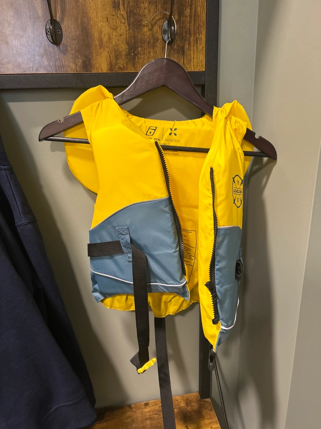Youth life jacket from Level Six in great condition! The colours are yellow and grey. Perfect for keeping your little one safe while enjoying water activities 60-90lbs